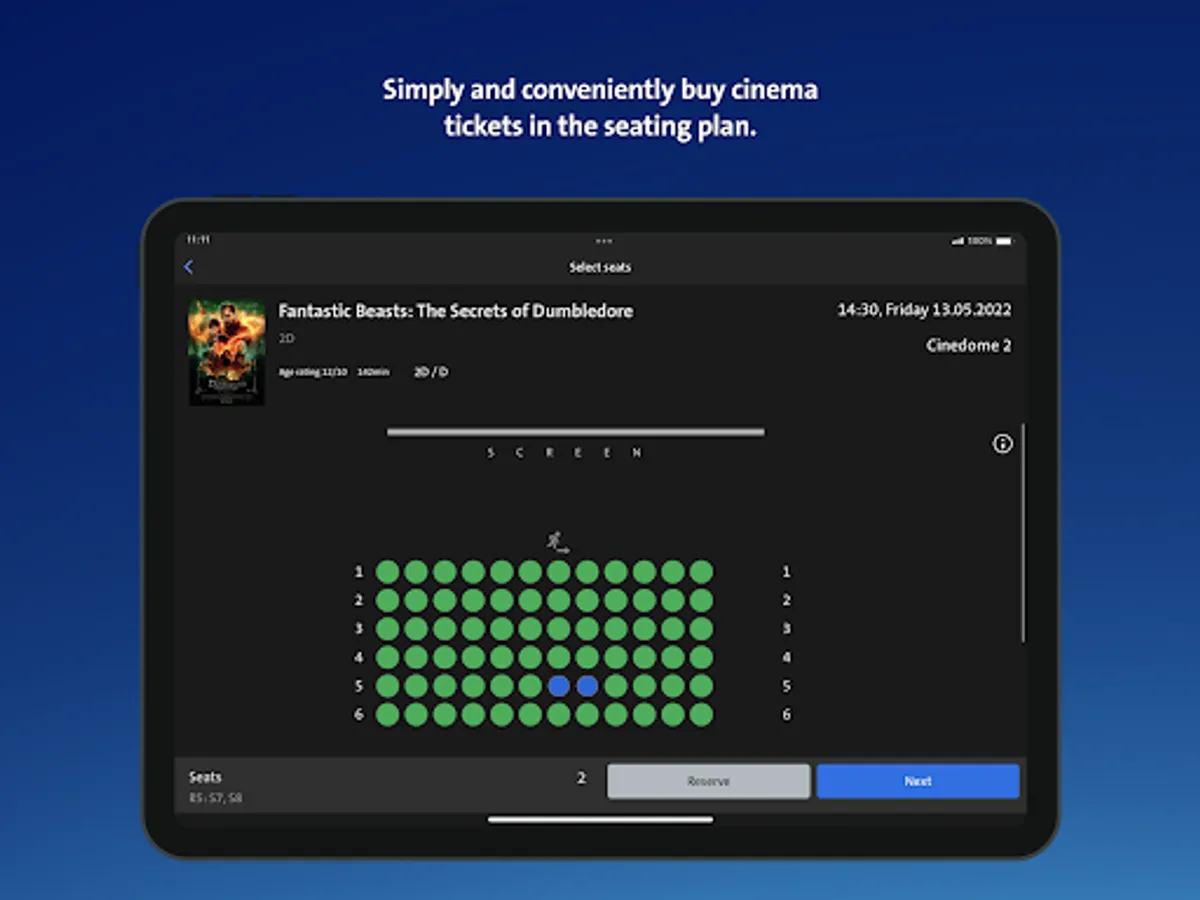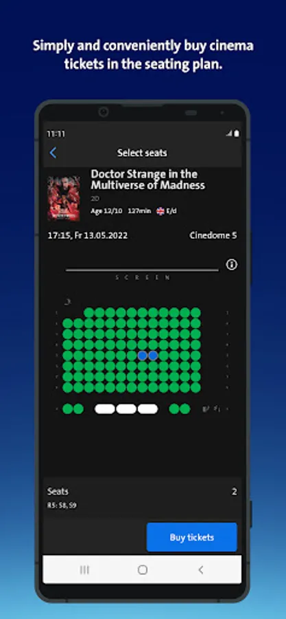 Kaufe und reserviere Kinotickets sitzplatzgenau. Mit den Tickets auf deinem Smartphone gehst du ohne zu warten in den Kinosaal.