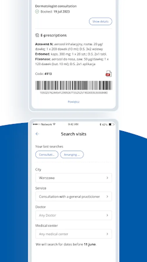 • Access to all types of medical events in one place - Visits, Tests (laboratory and diagnostic), Orders for drugs, Consultations online and Telephone consultations visible in all possible statuses