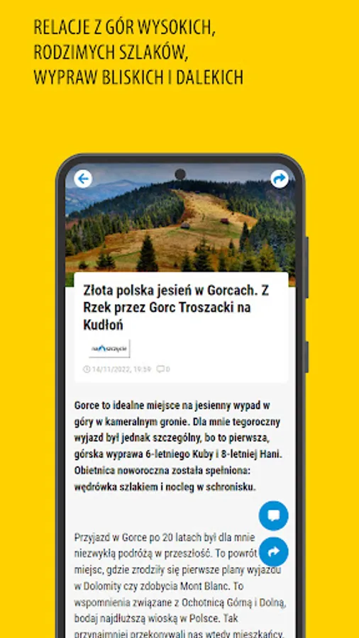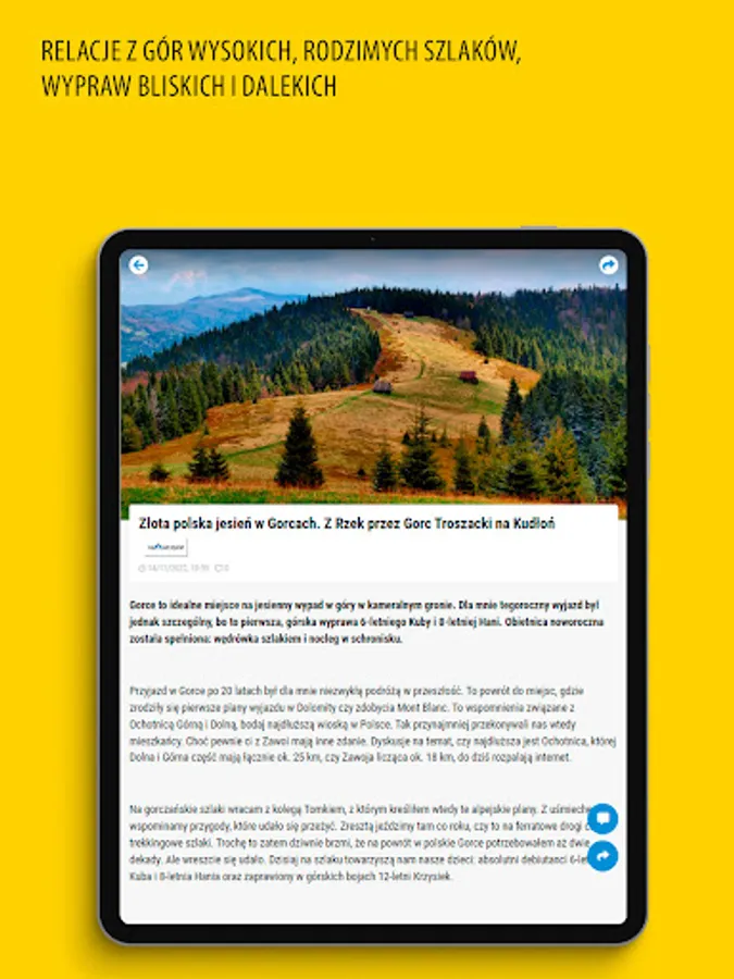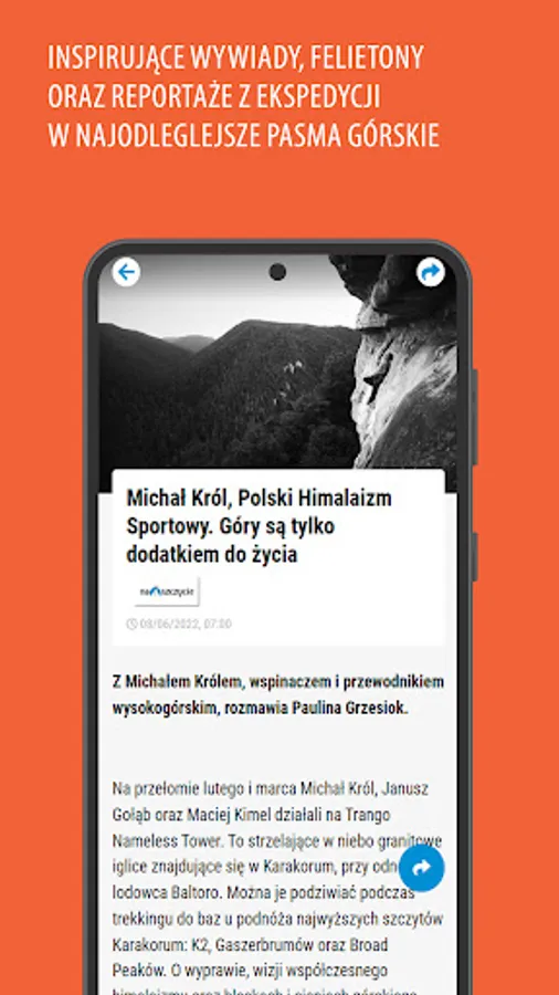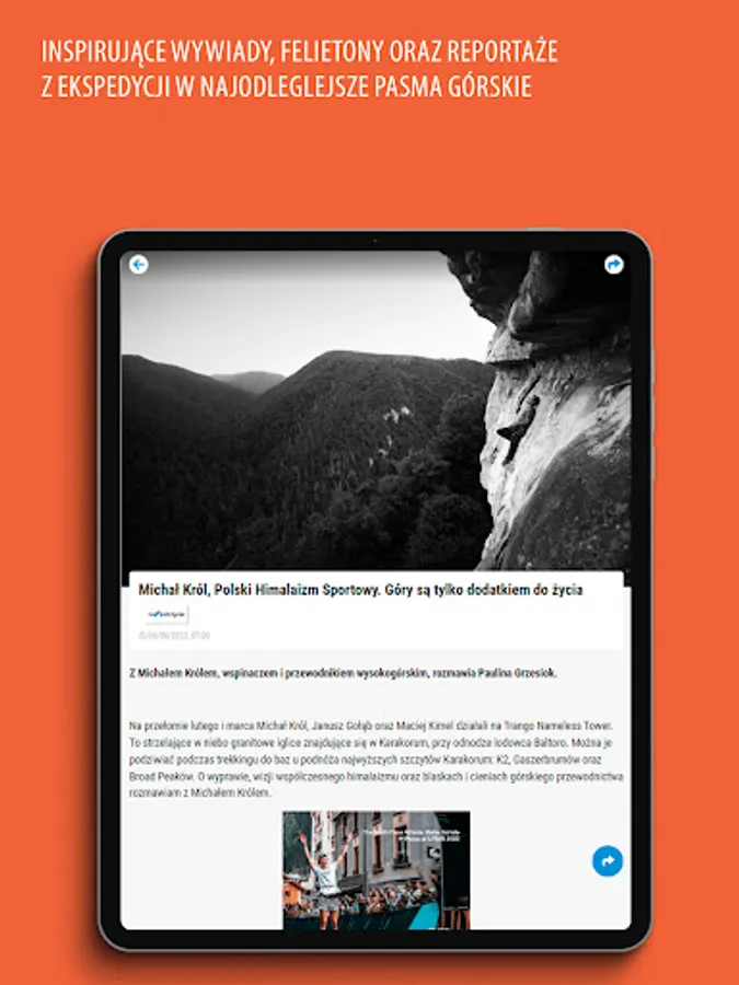 Our texts are addressed to people who love mountains, trails, climbing and any form of active recreation at sea level. In Poland and abroad. From trekking, through mountaineering, to a weekend walk with the family. We talk to climbers, give voice to travelers and test mountain equipment with them. We are everywhere you can walk, run and ride a bike. It's our passion. We want to encourage you, inspire you and show you the direction to reach new heights. Higher, farther, beyond the horizon. We write about it.