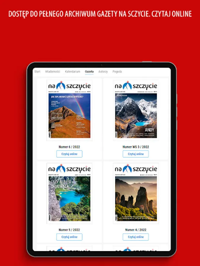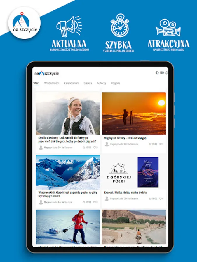 Na Szczycie magazine is a report from high mountains, native trails, expeditions near and far. Starting from hiking in the Tatras or Beskids, to Alpine peaks and Himalayan glaciers. Each issue is complemented by inspiring interviews, equipment tests, galleries and practical guides. As well as reviews of mountain books, columns and reports from expeditions to the remotest mountain ranges. The magazine is created by mountain people, experts and readers for all mountain enthusiasts.