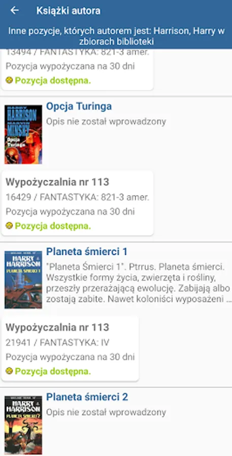 all you have to do is scan (or more accurately photograph) the book's bar code on your phone to get full information about the volumes of the series or other items written by the author. In the case of a series (cycle), we additionally find out whether individual volumes are to be read in the right order or not necessary - we read freely. The application works on both the library code as well as the ISBN code printed on the book. A scan of the code from the book (new) in the bookstore will tell us which institution already has it in its collections. The information is supplemented with a map with the institution and its opening hours marked.