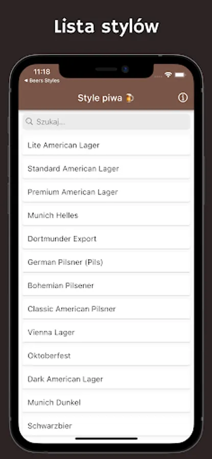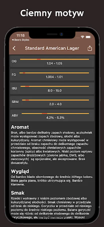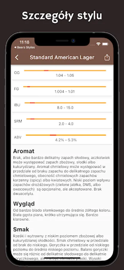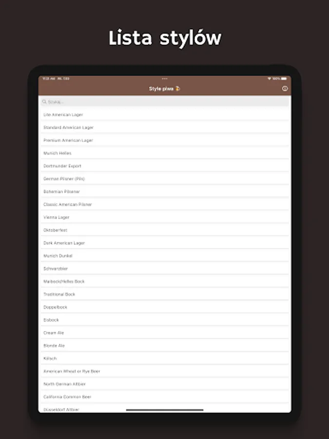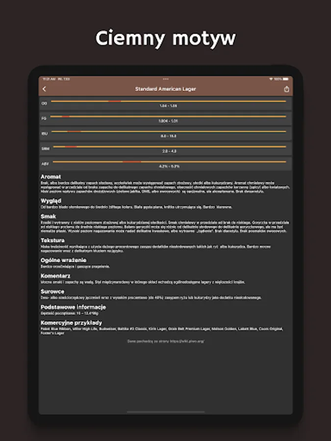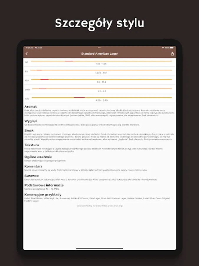 A list of beer styles containing information about aroma, appearance, taste, texture and style parameters.