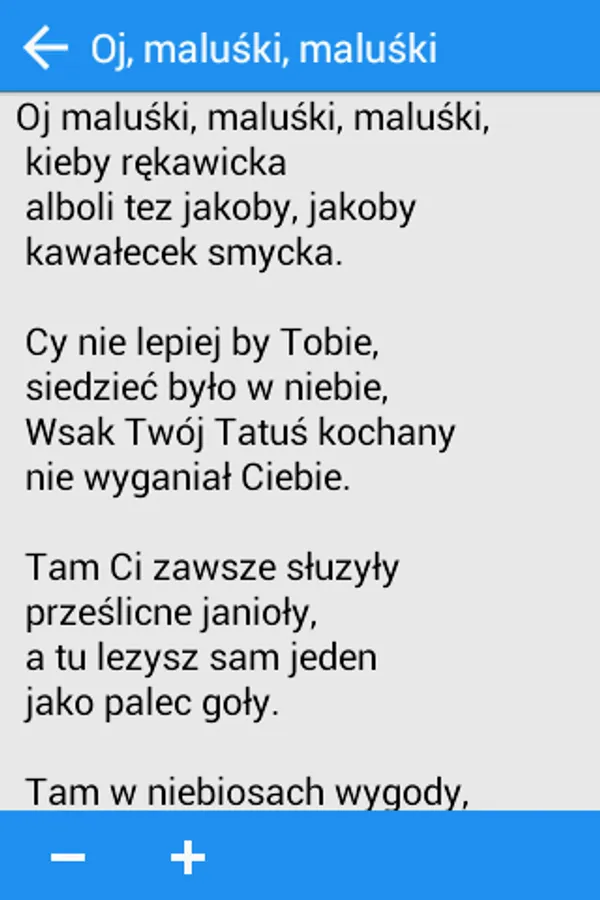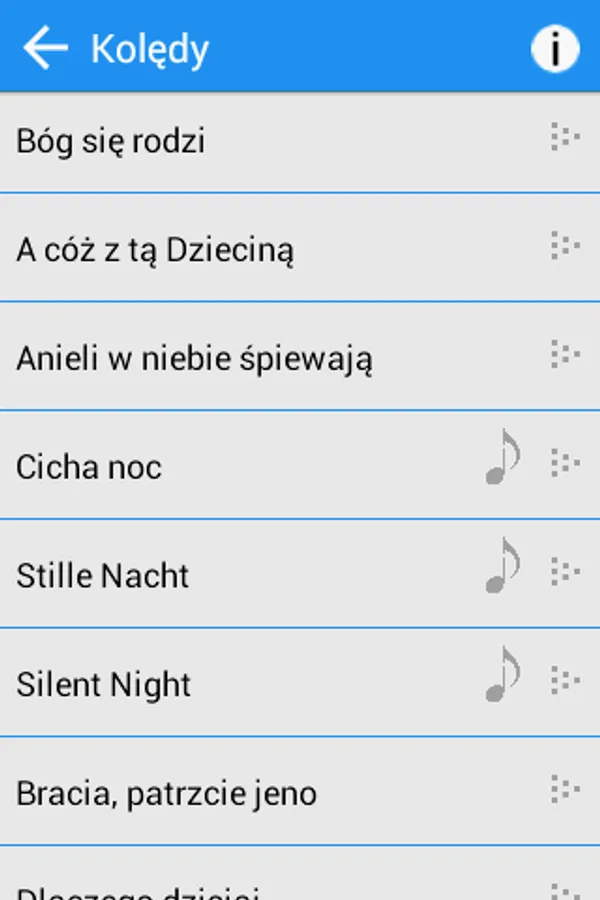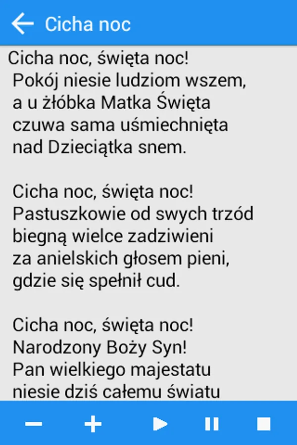 The application contains the text of 70 Christmas carols. Some are accompanied melody. It was prepared to sustain and revive the custom of singing carols in common, and thus recall the beauty of the Polish language, melody and custom.
