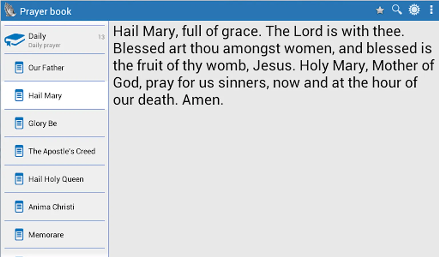 Roman catholic book of prayer for christians. The best and biggest common book of prayer. The application includes a collection of more than 260 catholic prayers in the daily prayers, the catechism, litanies, novenas, rosary beads, lace, an hour, Lamentations, Stations of the Cross, an exorcism, the 15 prayers of the holy Brigida, prayer from Pieta prayer book and others. This application get you closer to god.