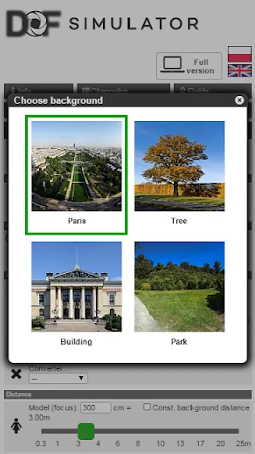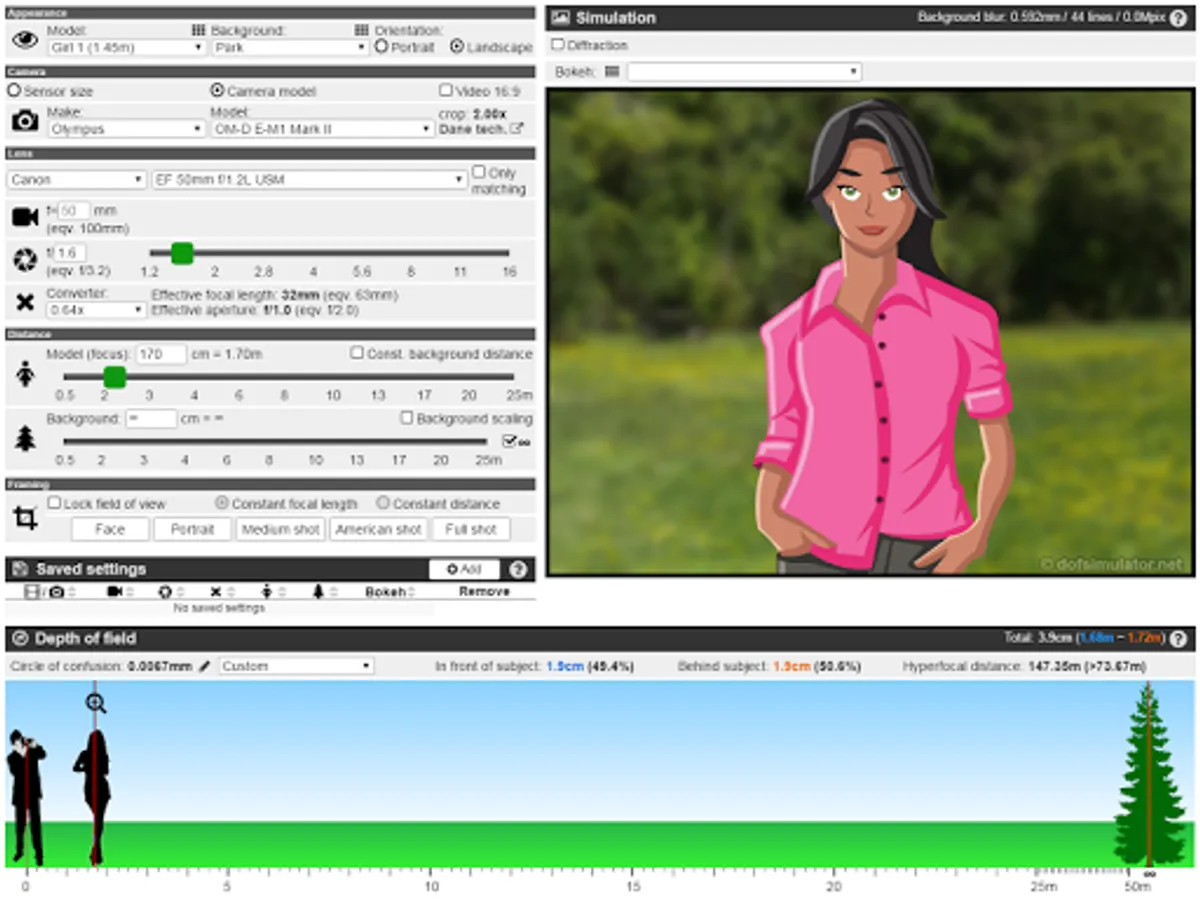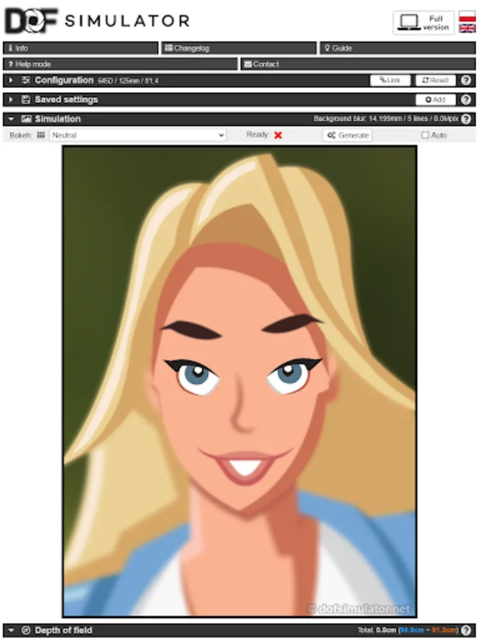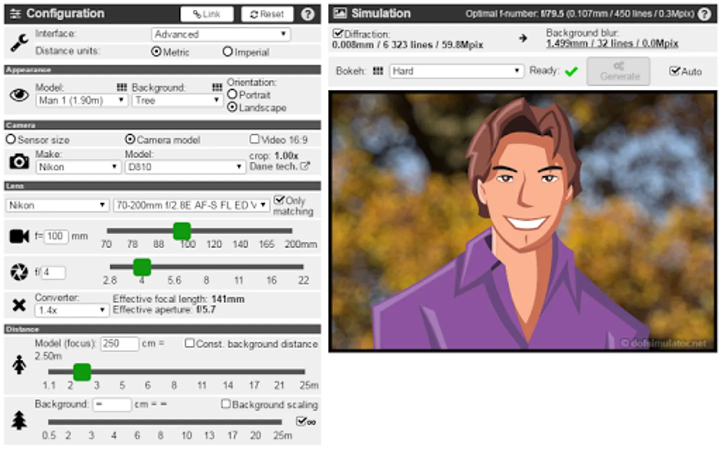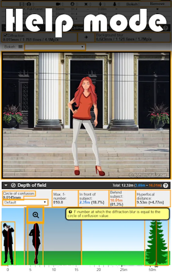Calculates camera depth of field and background blur and simulates it on a photo for any lens, camera and distance combination with different types of lens blur (bokeh).