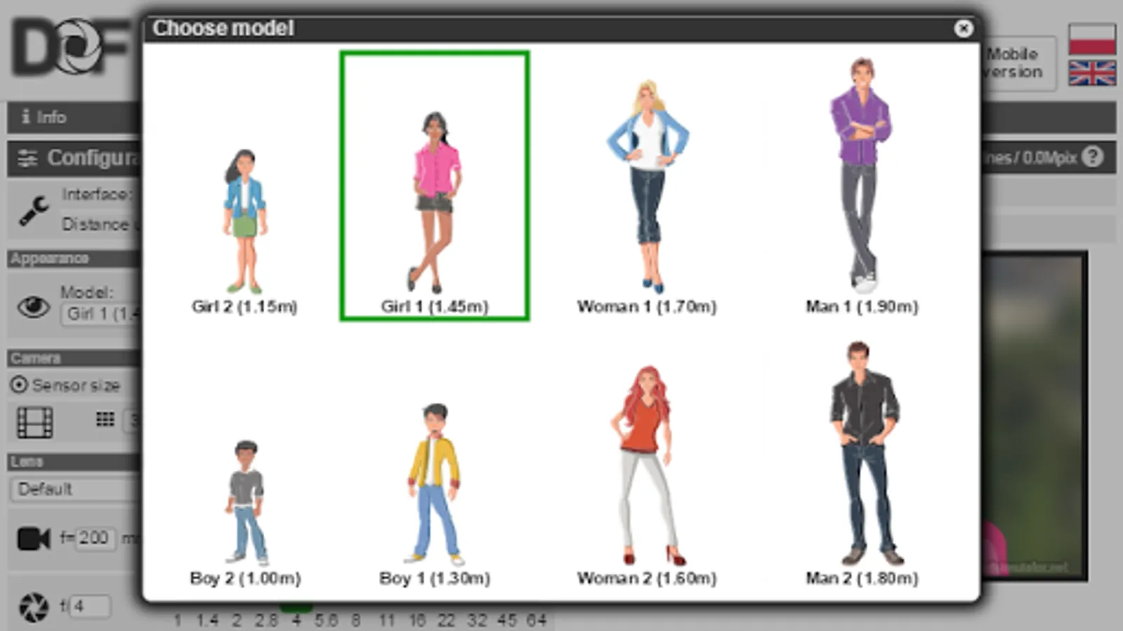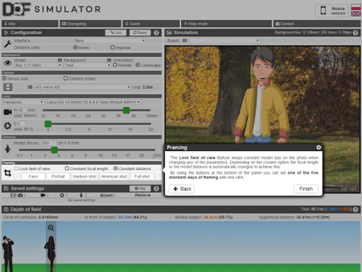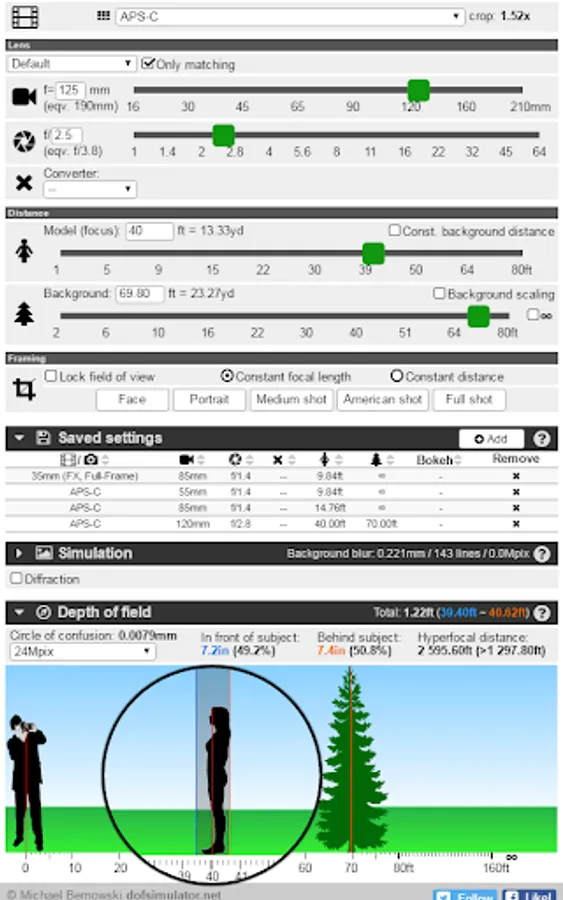 Mobile version of the dofsimulator.net online tool.