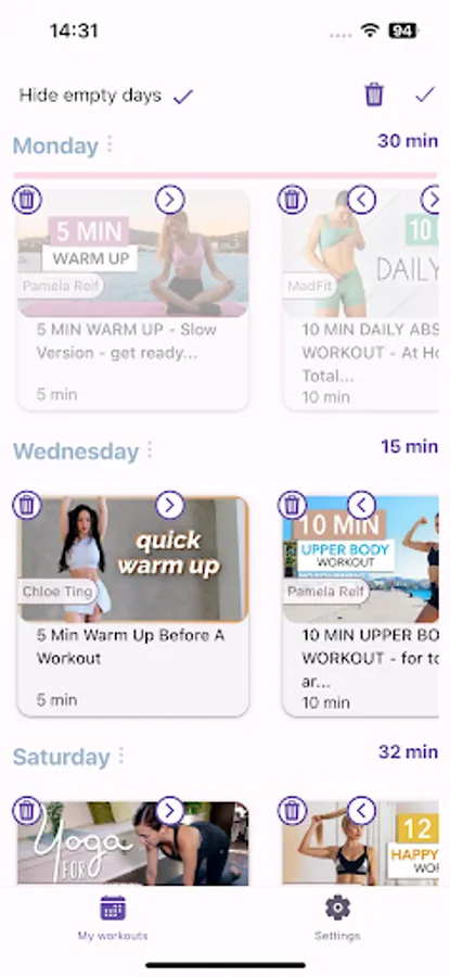 Keep track of your progress and have your workouts elegantly organized. You can compose workout plans using different trainers for each day or even each workout.