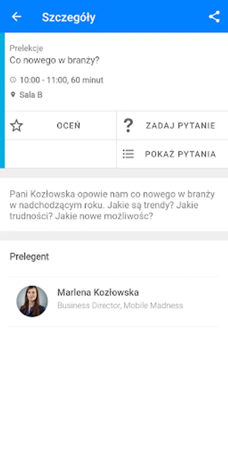 Nowadays more and more network traffic moves to mobile. It seems natural to offer our clients this kind of service. A mobile application for a conference is a great tool to inform its participants about the conference place and time, directions, hotels, agenda, speakers, etc. A possibility of sending Push Notifications enables the participants to being kept up-to-date about any changes in the agenda or other news.