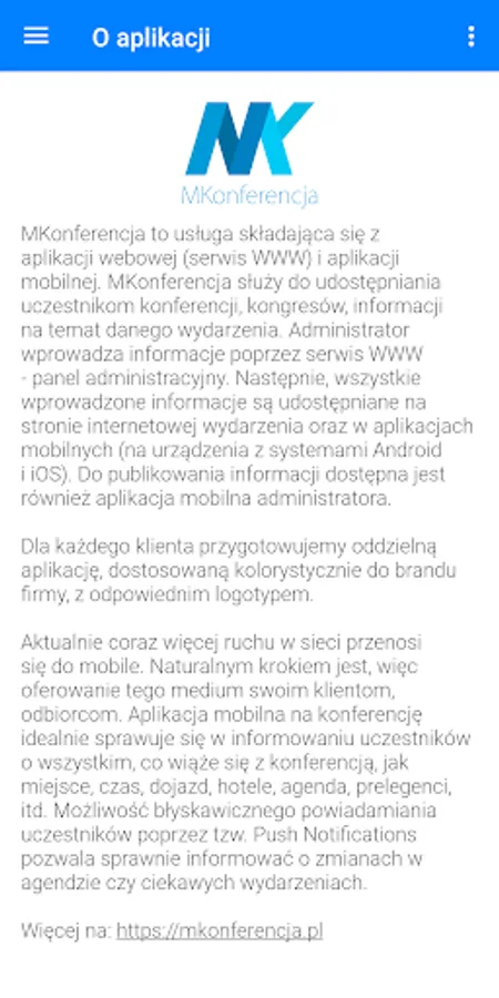 MConference is a service consisting of a web application (web page) and mobile application. MConference is used for providing participants of the conferences, congresses with information about the event. The administrator enters information through a web service – the admin panel. All entered data are made available to the web page of the event and in mobile applications (for Android and iOS). For publishing information, we prepared a mobile application for the administrator.