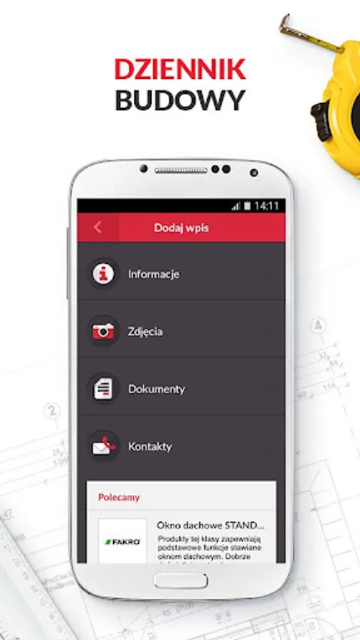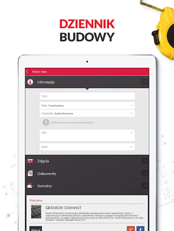 The heart of the application - an interactive diary that organizes the entire building. Space for notes, photos, documents, contacts, and all the information related to your building - a chronicle and a photoblog in one. Thanks to regularly conducted entries, you can watch the progress, document their progress and, if necessary - quickly return to a specific date and check, for example. Where the cables installation. For the entry you can add photos of documents related to the particular stage, including an agreement with the contractor, the acceptance protocol works, or invoice for purchased construction materials - thanks to the application mobiDOM all information related to the construction of your home will be always at hand!
