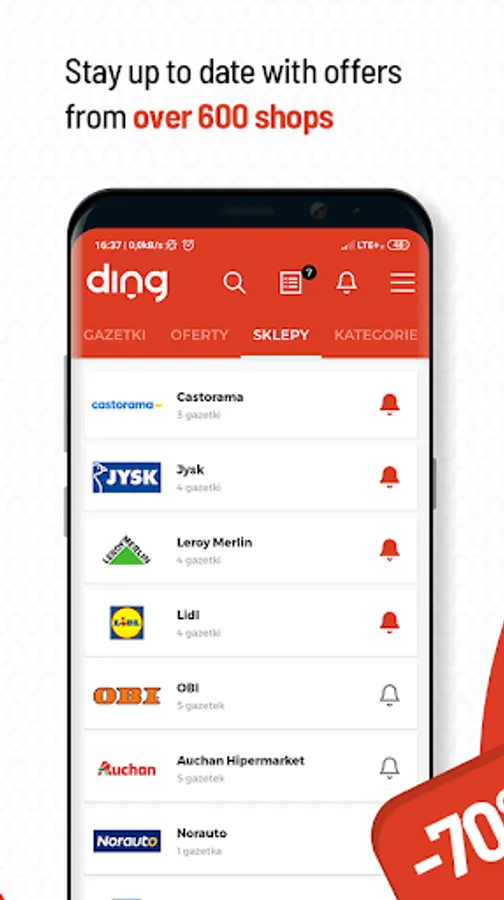 The DING application is set to the location, what does it mean? By creating your own account, you will be notified of all current promotional offers that are closest to your home. Moreover, you can set them according to your requirements, among others by checking the request for information about the ending validity of the offer for the selected product in the store. With the map icon in the top right-hand corner, you can browse through previously displayed stores and see exactly where they are. With DING it is even easier to find more customized products every day, renovate your home or choose products for special occasions such as the Black Friday, Christmas or Easter.