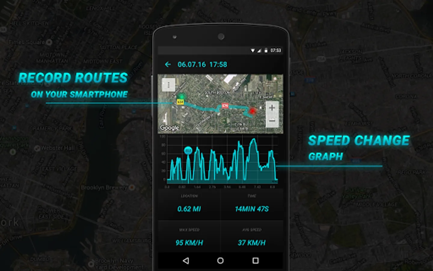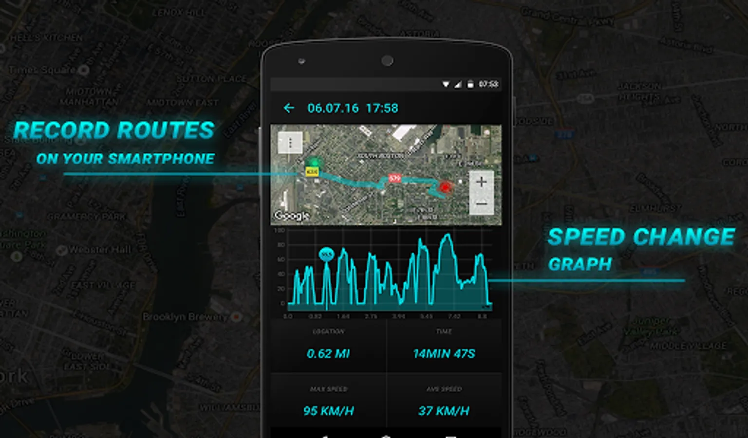 - Automatic recording of data: average and maximum speed, distance traveled, route