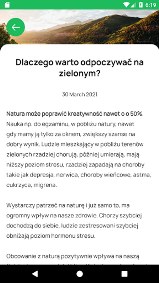 Nature can improve creativity by up to 50%. Learning, for example, for an exam, close to nature, even when we only have it outside the window, will increase the chances of a good result. People living close to green spaces fall ill less often, die later, have a lower stress level, and suffer less from diseases such as depression, neurosis, coronary diseases, asthma, diabetes, migraine.