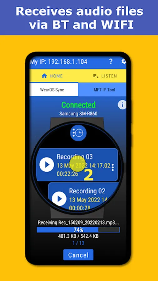The app gives you 2 methods to receive recording audio files: Wear Engine and MFT IP Tool. You can switch between them without any limits. Wear Engine is selected as default method, as it is officially supported engine by Huawei Harmony OS.