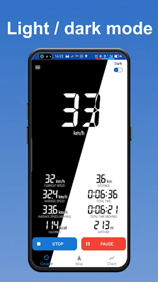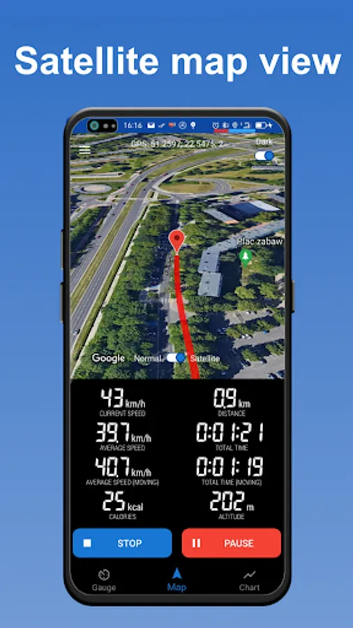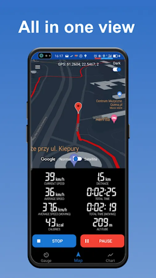CoBike tracks speed, distance, altitude, and time. It also gives you a map showing where you have been while you are saving a run.