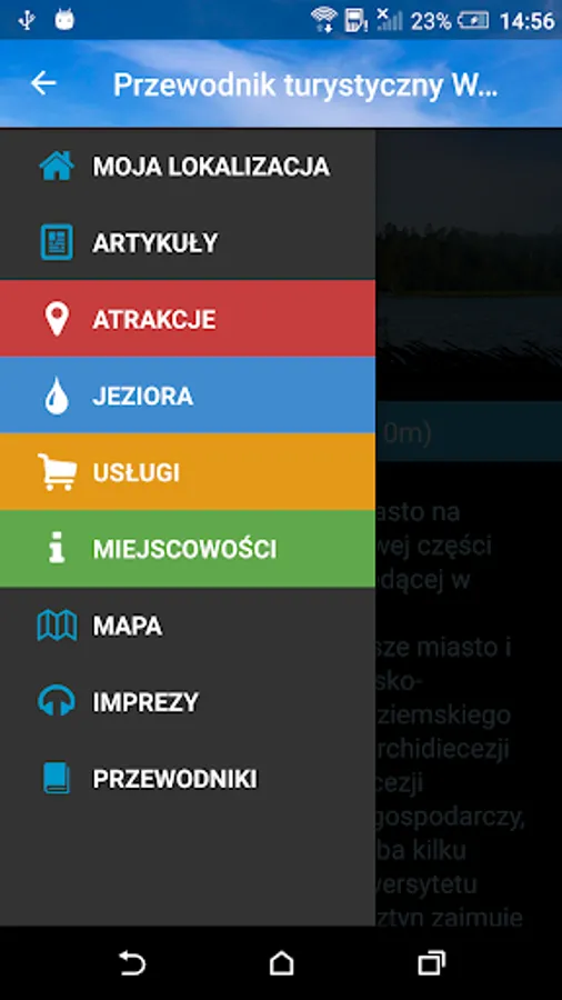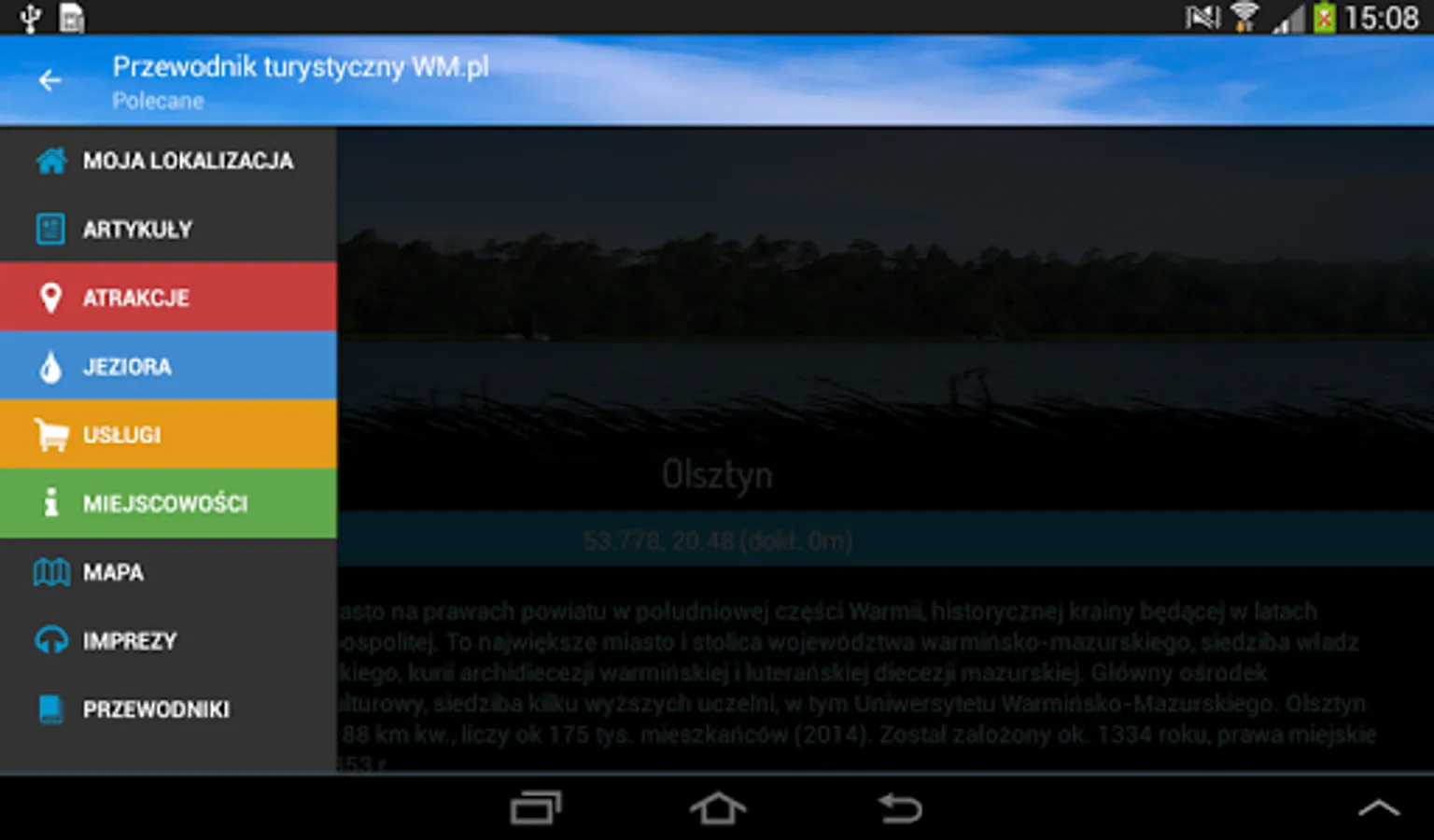 Tourist guide WM.pl allows for the discovery of the coming attractions, getting to know the local lakes and towns. Our application will tell where to find accommodation, shopping, eat well, for which the event is worth to choose whether the best places to catch bass.