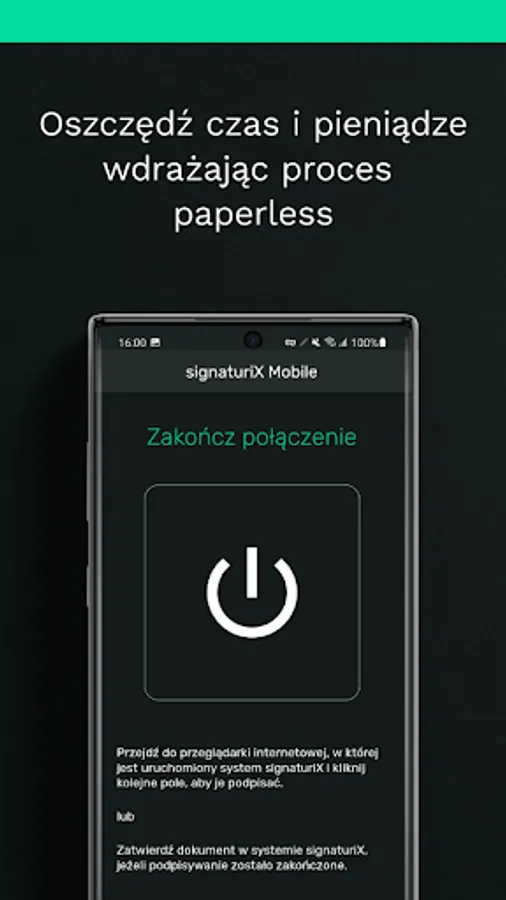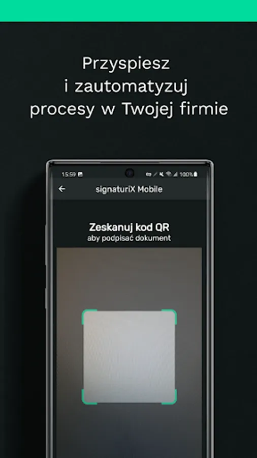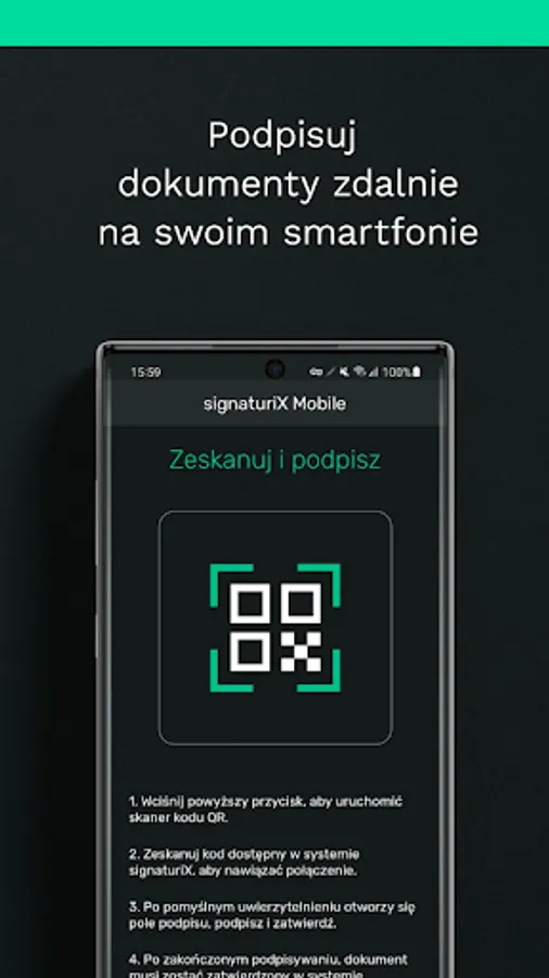 Scan the signature QR code in a PDF document opened in the SignaturiX system to be able to sign it by hand on a mobile device. Thanks to SignaturiX you will limit the number of paper documents, replacing them with an electronic form - a PDF file signed in accordance with the ISO standard and the PAdES format. The signature is placed on devices equipped with touch screens and, depending on their types, a number of parameters unique to each person, which can be used in the analysis of signature authenticity, are recorded. SignaturiX has safeguards that ensure that the document is integrally connected to the signature, and that its content and biometric signature data do not fall into the wrong hands. All communication with the SignaturiX system takes place using an encrypted connection, and the biometric data of the signature are additionally encrypted with a cryptographic key.