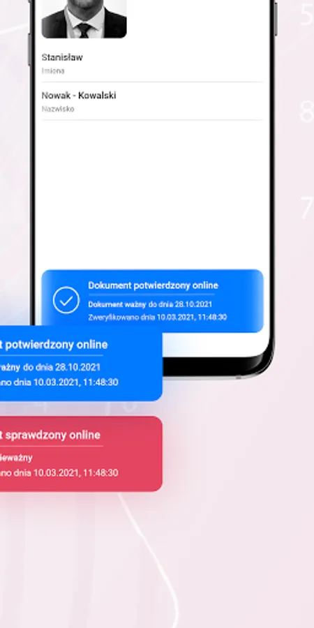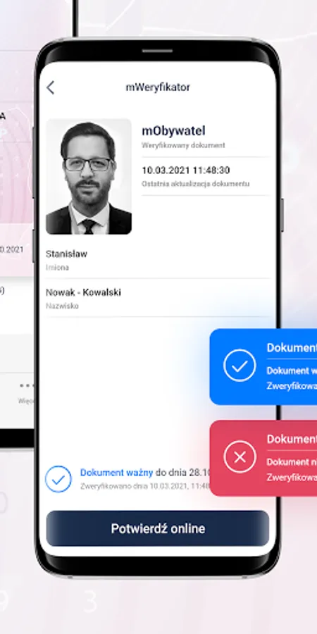 • When verifying the mObywat document, you will check: Name and surname, low-resolution photo, date and time of verification, certificate status.