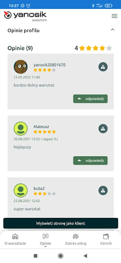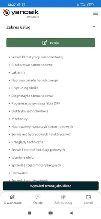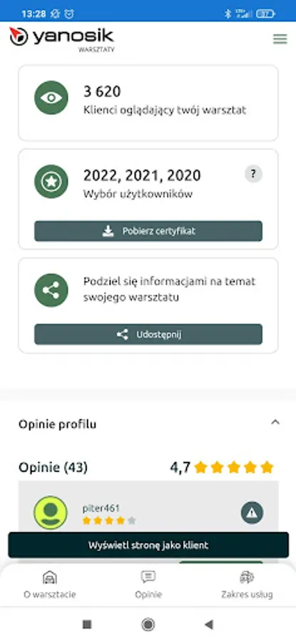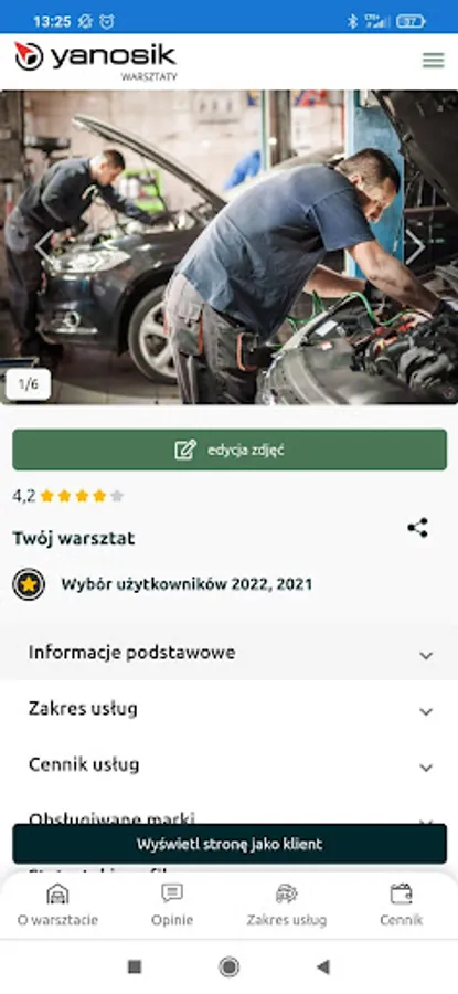 The application is intended for mechanics who have a showcase of their workshop on the yanosik.warsztaty.pl portal. Thanks to it, you will gain control over the image of your website in the Yanosik application and on the portal, including the possibility of: