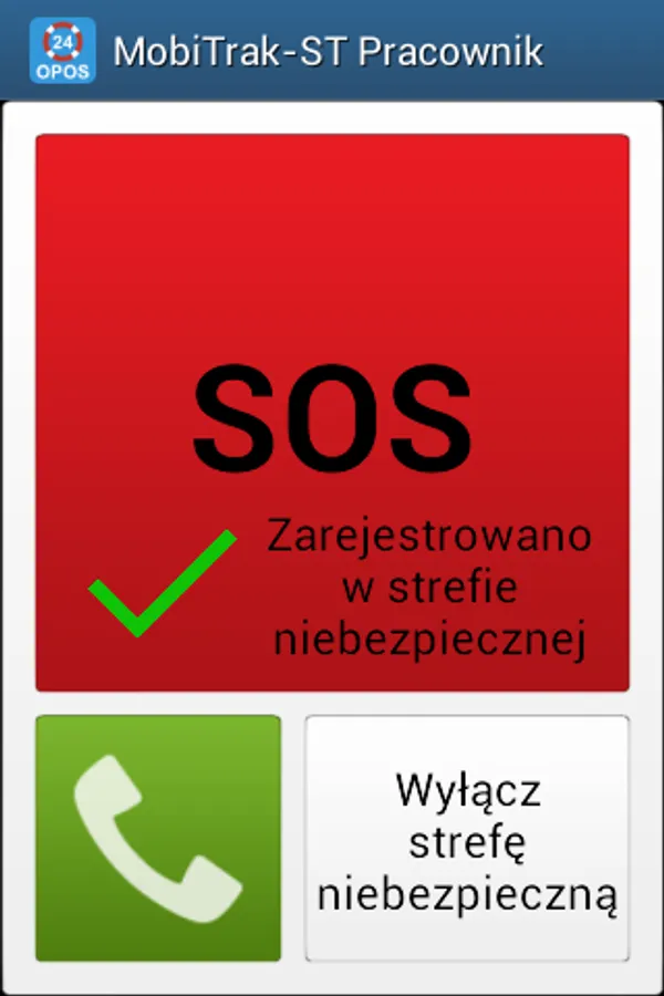 MobiTrak-ST employee is part of a telecare system OPOS24.pl. The application turns your mobile phone in a modern and easy to use "tracker". All the complicated options are hidden, and the main menu is replaced by a simple and transparent panel, where the main role is played by the SOS alarm button.