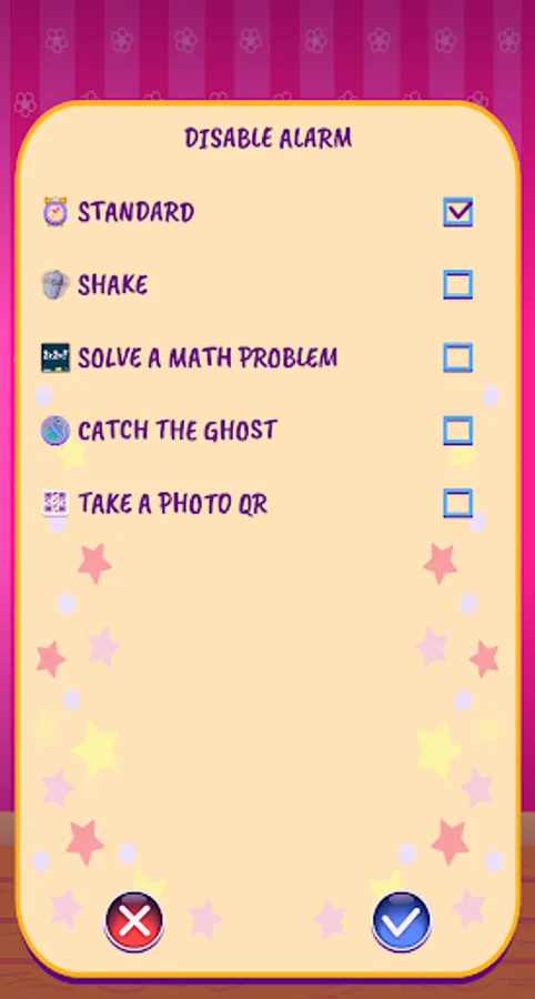 Choose your favorite alarm: a loud signal or a soothing, relaxing melody. Select one of the smart ways of disabling the alarm: