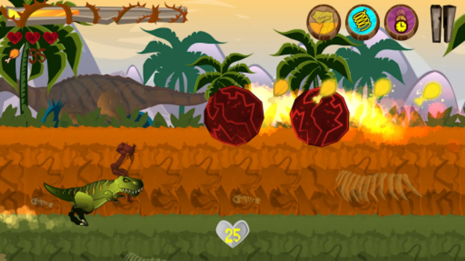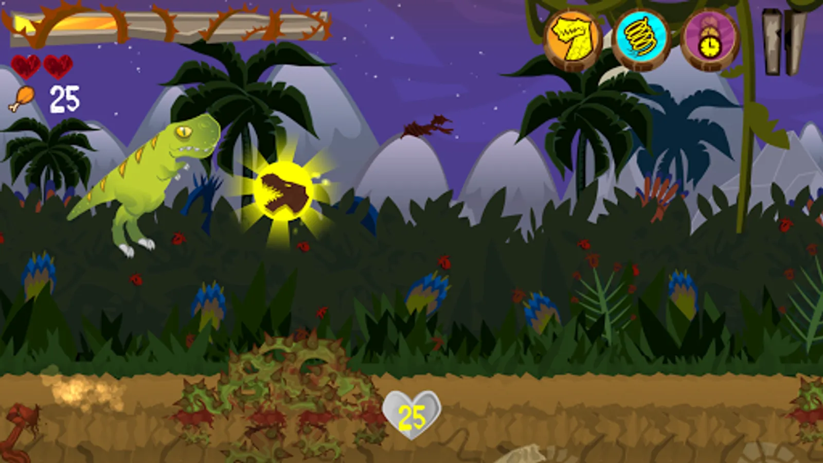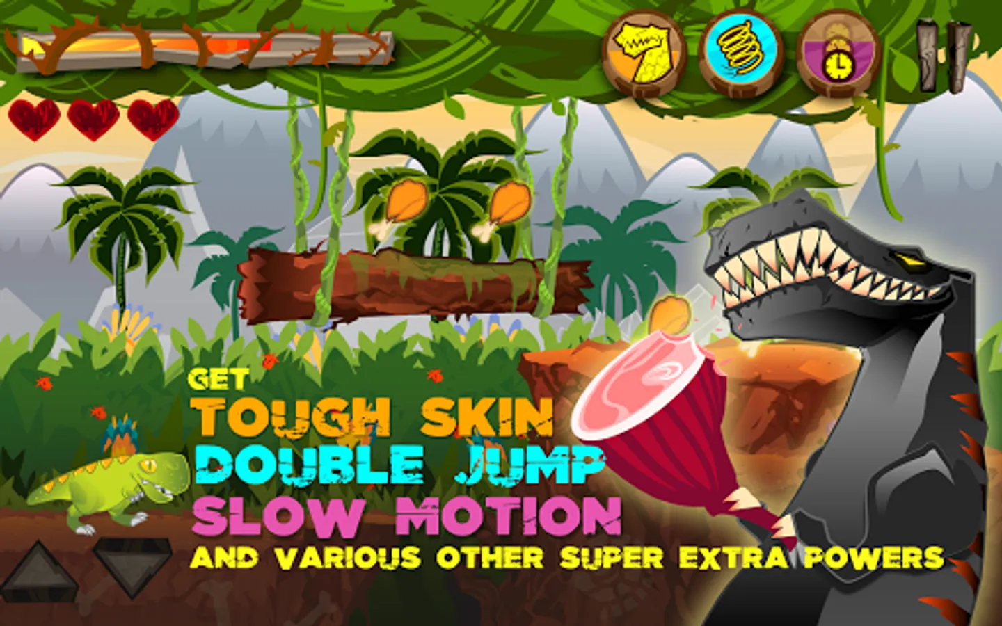 Do not forget to visit Dino’s Cave. There you can watch as the character grows, view his collection of trophies and also his extra powers: Slow Motion, Double Jump and Tough Skin.