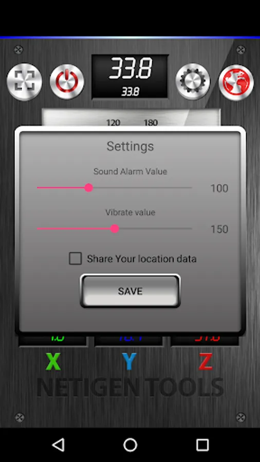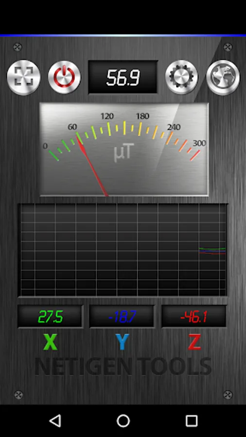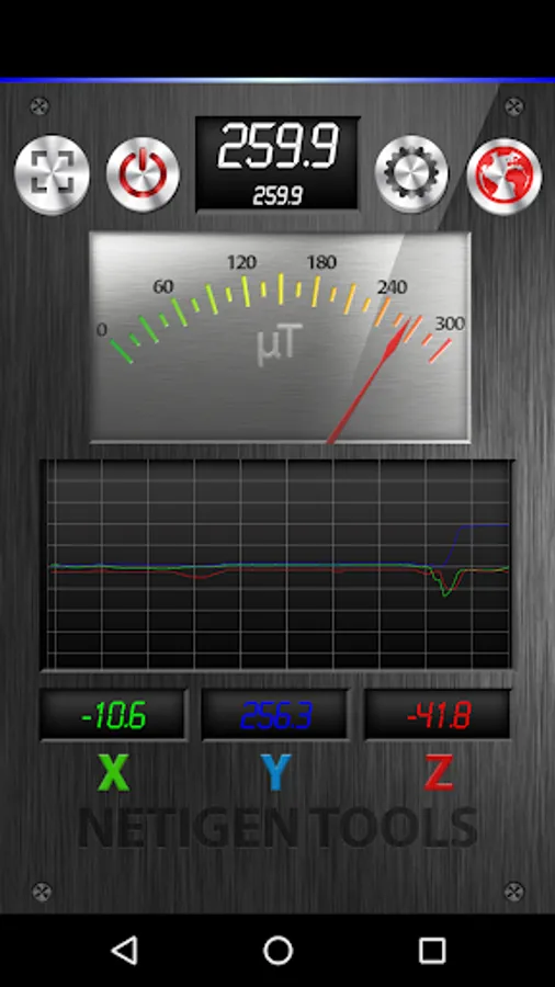 Usage is quite simple: launch this application on your mobile device and move it around. You will see that the magnetic field level shown on screen is constantly fluctuating. Colorful lines represent the three dimensions and the numbers on top shows the value of magnetic field level (EMF). The chart will increase and the device will vibrate and makes sounds announcing that metal is close. In settings you can change the sensitivity of vibration and sound effects.