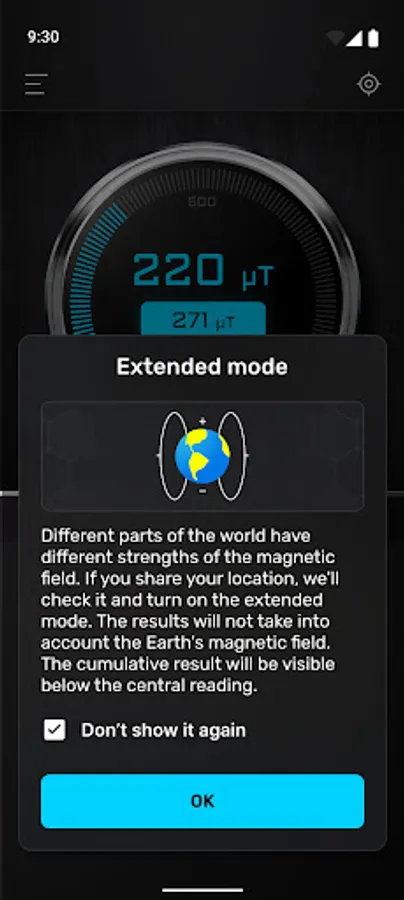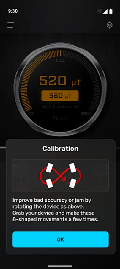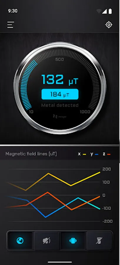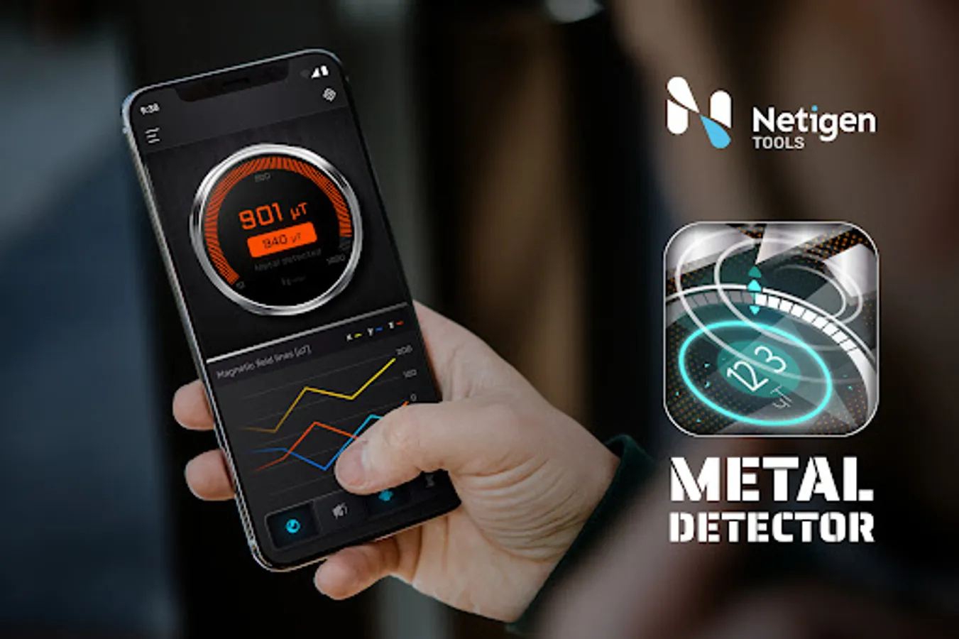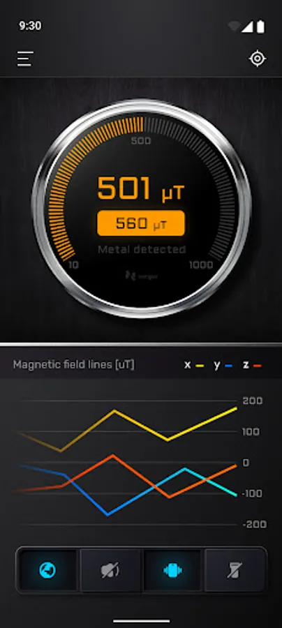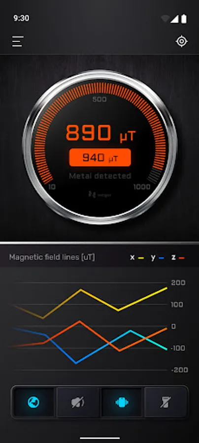 Metal Detector is an Android application that detects the presence of metal nearby by measuring the magnetic field value. This useful tool uses the magnetic sensor built into your mobile device and shows the magnetic field level in μT (microtesla). The magnetic field level (EMF) in nature is about 49 μT (microtesla) or 490 mG (milligauss); 1 μT = 10 mG. If any metal is nearby, the value of the magnetic field will increase.