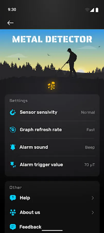 The usage is simple: launch this app on your mobile device and move it around. You will see that the magnetic field level shown on the screen is constantly fluctuating. Colorful lines represent the three dimensions and the numbers on top show the value of the magnetic field level (EMF). The chart will increase, and the device will vibrate and make sounds, announcing that metal is close. You can change the sensitivity of vibration and sound effects in the settings.