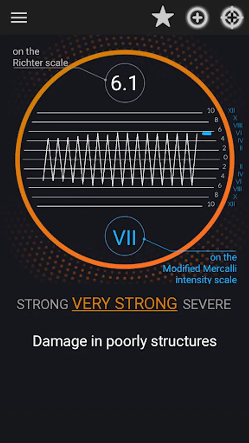 ★ App shows reference to earthquake vibrations as classified by internationally used Mercalli intensity scale for seismic activities such as earthquakes. The Mercalli intensity scale is a seismic scale used for measuring the intensity of an earthquake. It measures the effects of an earthquake. Vibration Meter can also be called seismograph or seismometer when used for measuring seismic activity.