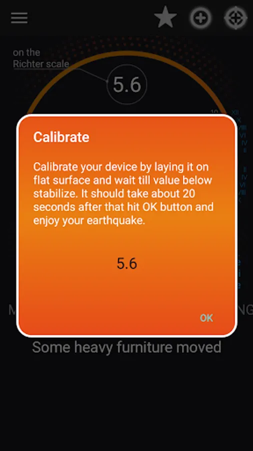 ★ To calibrate application click on the button - "calibrate", put your device on the flat surface and wait till value stabilize. It should take about 20 seconds. After that click OK button and enjoy the earthquake!