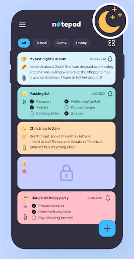 Keep your secrets safe – you can lock app with password or secure chosen notes with lock. Make a backup and restore the content whenever you need!