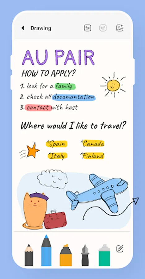 - Drawings – you can draw directly in the notepad app and add a drawing to your notes – choose a pencil, pen, crayon, or marker and draw anything you want!