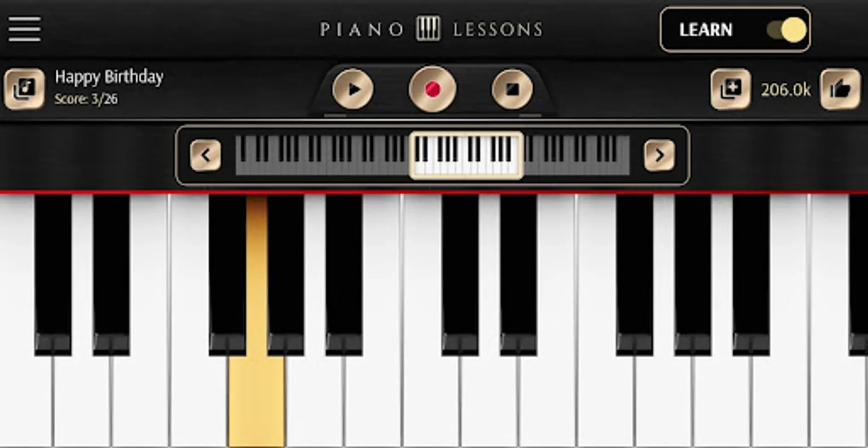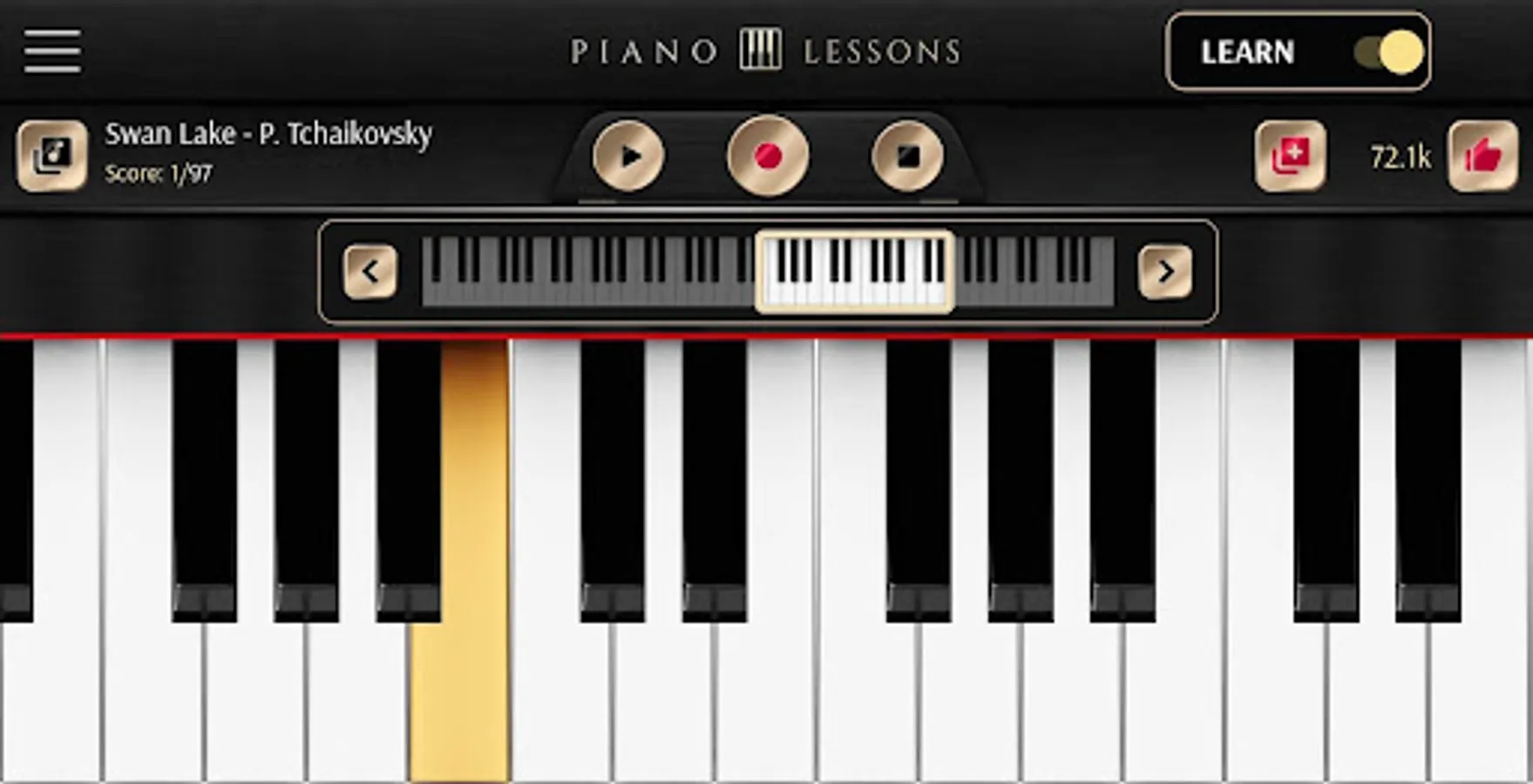 The application can also be used as a piano without learning mode. There is also an option to record your own songs. The recording function will allow you to save your musical compositions and play them later. You can set the amount of visible piano keys from 10 to 24. You can move the keyboard with one key or one octave to the right or to the left. This magic keyboard piano will be like your virtual teacher.