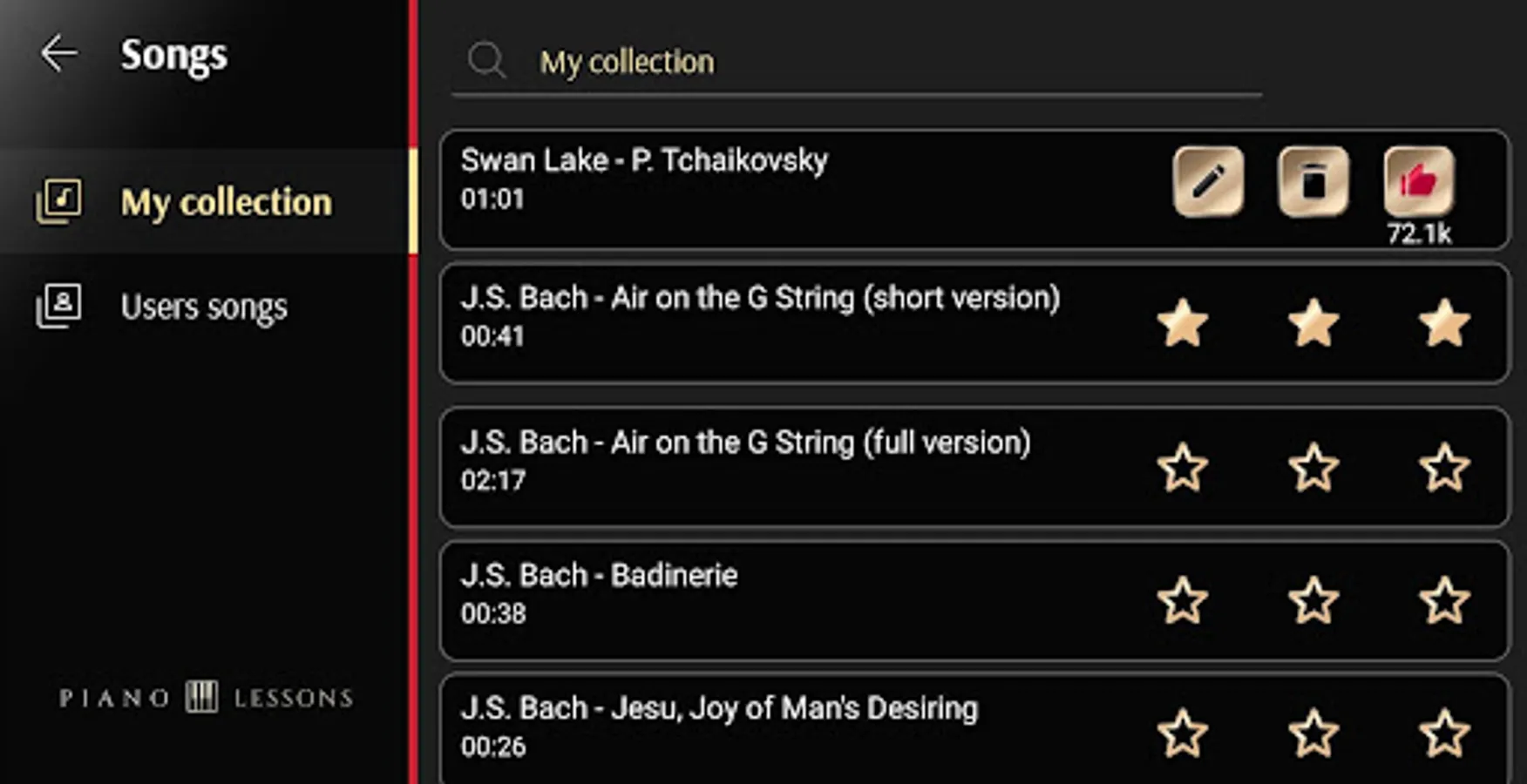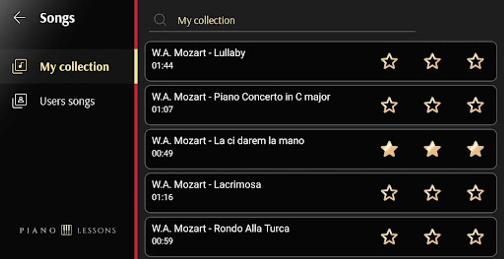 Play a song from our list, listen to it and then click on "Learn how to play". Click on the highlighted yellow keys and play the whole song. The application will rate your performance. Become a champion and get 3 stars for each played song!