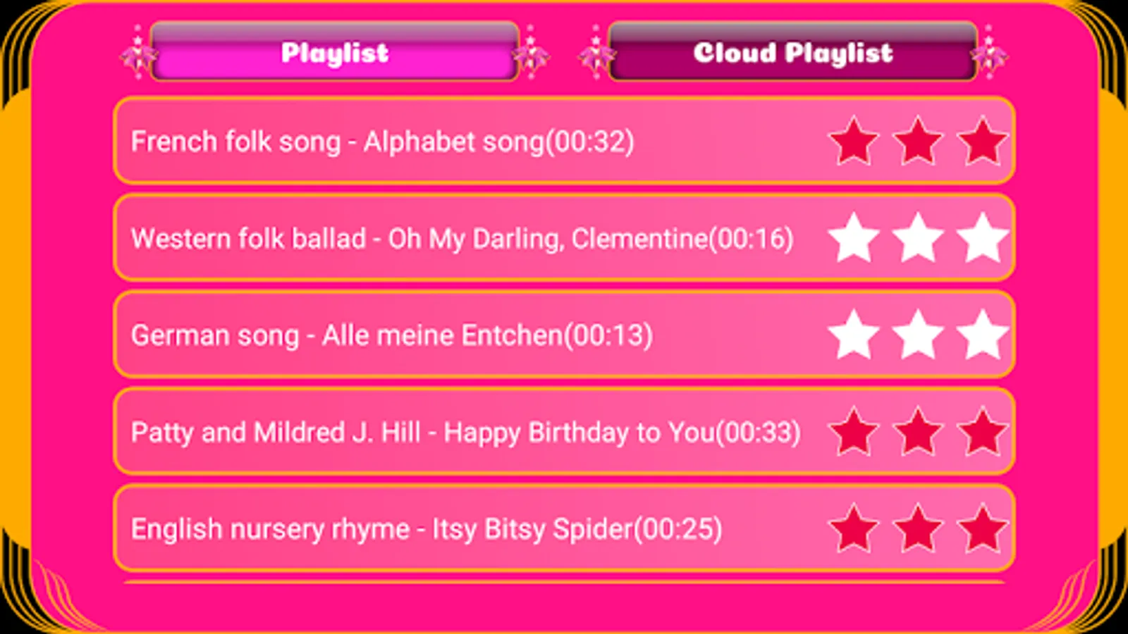Play a song from our list, listen to it, and then click on "Learn how to play". Click on the highlighted yellow keys and play the whole song. The application will rate your performance. Become a champion and get 3 stars for each played song!