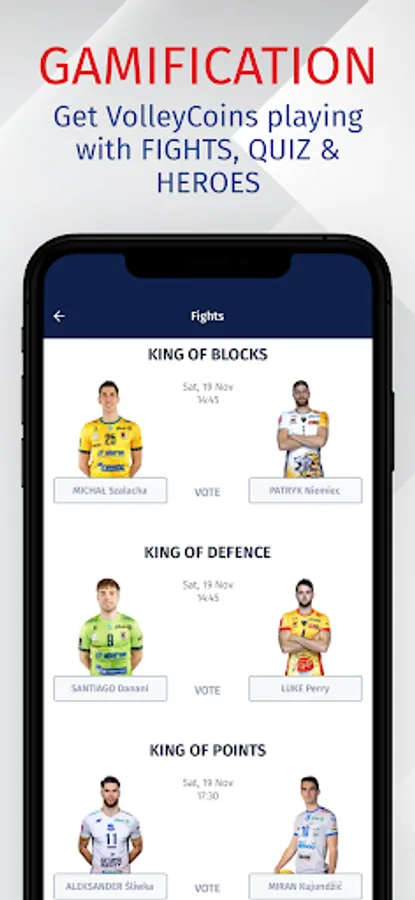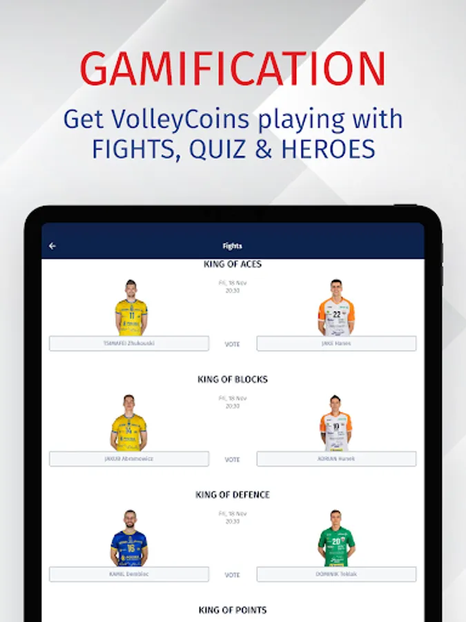 - gamification of #FIGHTS - competition between players on their stats, #QUIZ - answer thousand of questions we prepared, and #HEROES OF THE GAME - vote on the best players in each position after gameplay