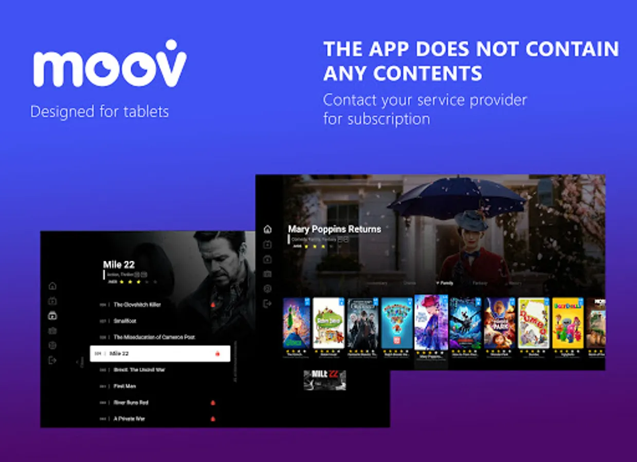 • The MOOV APP doesn't contain any TV or Movies contents, it is intended for IStream Middleware TV platform Demo.