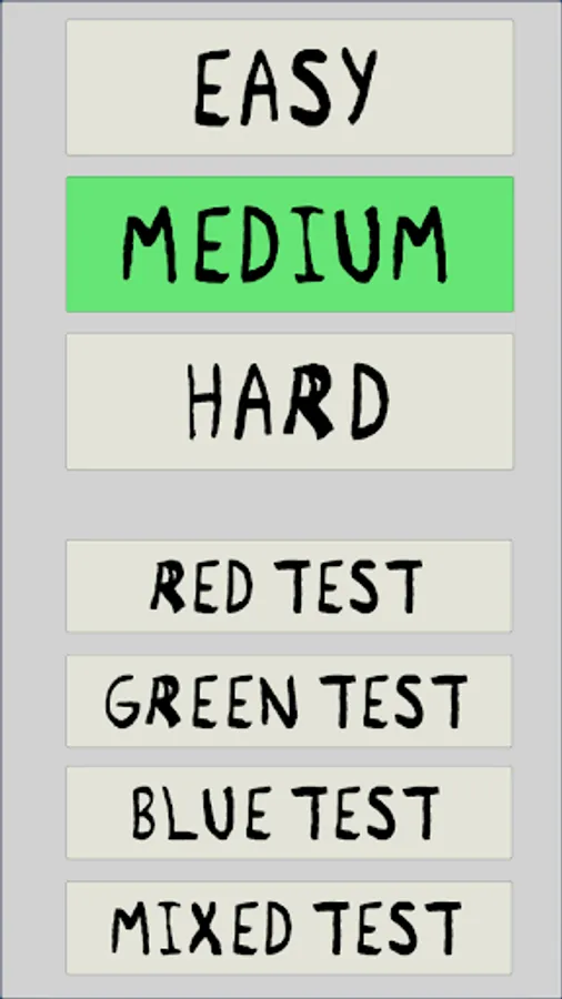 You can choose how hard test will be, and what color u want to test, red, green, blue or mixed.