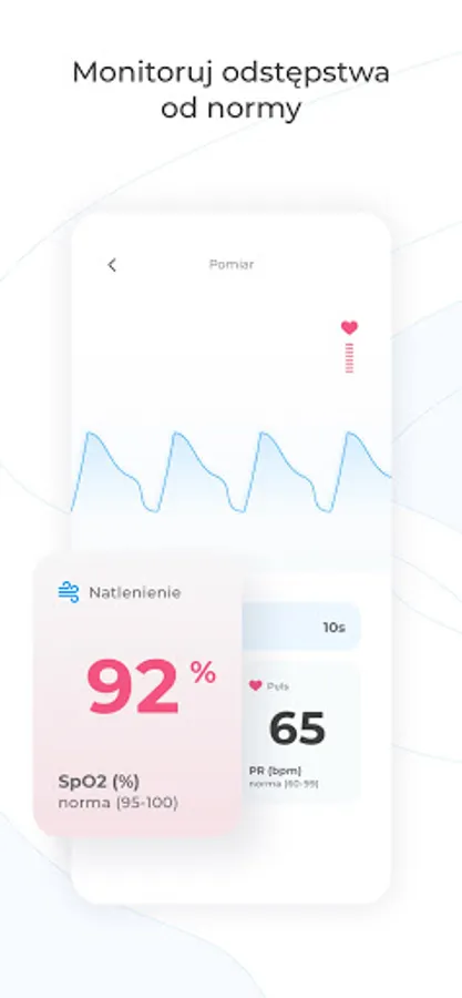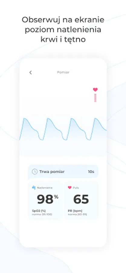 During the measurement, you will see on the screen the oxygenation values changing with time presented in numerical form and pulse values presented both as a number and in the form of a bar and line graph (the so-called pulse curve).