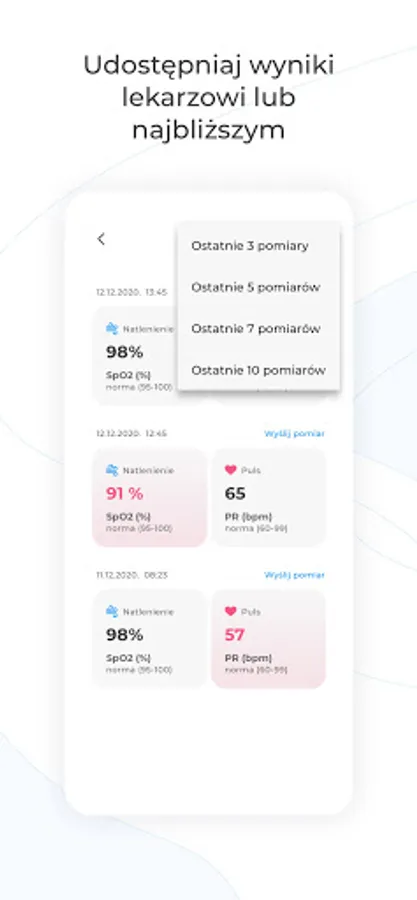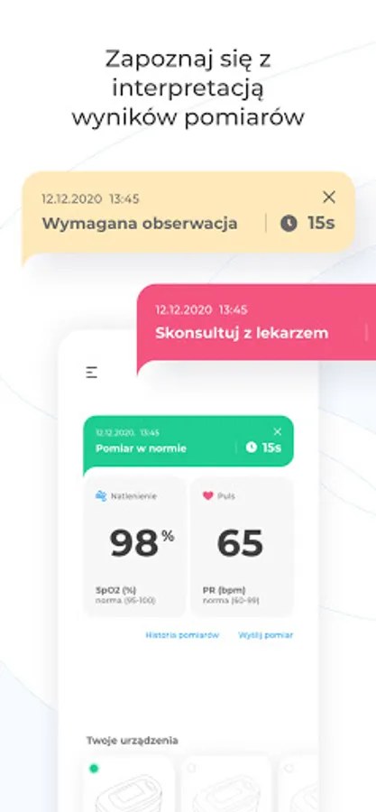 The application will automatically save the measurement results, interpret them and inform you whether the measurement result is normal (green color of the message), requires further observation and subsequent measurements (yellow color of messages), or immediate consultation with a doctor (red color of the message).