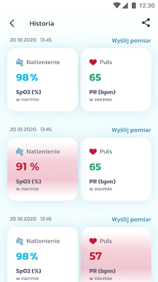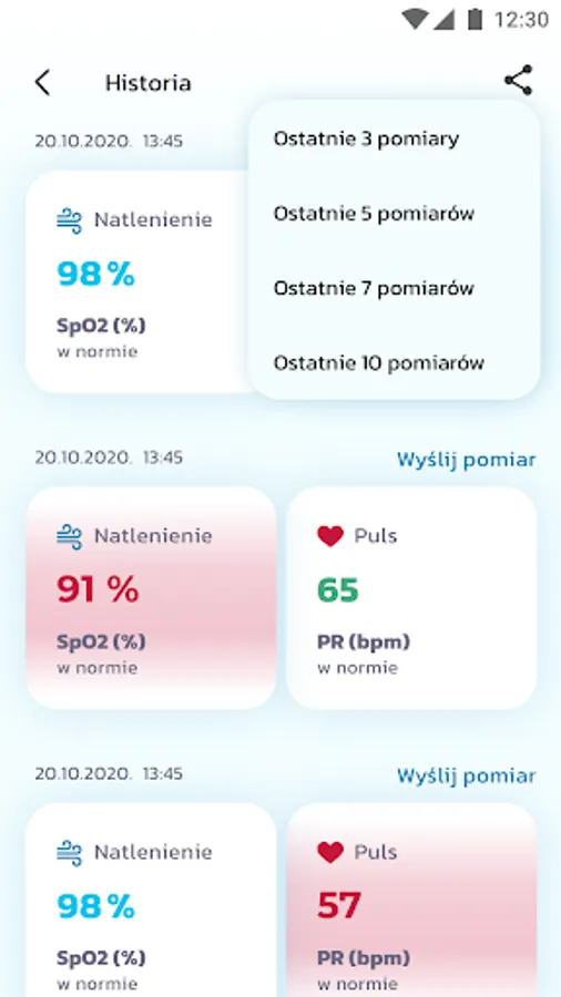 The data is stored in the "History of measurements" and is available for inspection at any time. Each performed measurement can be conveniently forwarded to the doctor or the closest one: by SMS, e-mail or communicator.