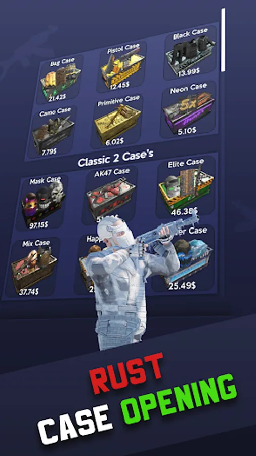 Rust Clicker is an idle Rust Case Opener Skins Simulator Game you will love! Build up your inventory, play a simple case clicker and earn rust skins. Level up your clicker and collect all achievements. Open unique rust cases in our case simulator. Join to the jackpot to have a chance win a lot of new items and more!