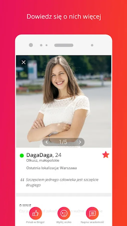 Select your search criteria, thereby specifying which men and women you are looking for. Regardless of whether you are just looking for new friendships or you want to arrange serious dates and soon you can join him a group of lovers happily in love - the application is the place just for you. At Sympatia.pl, flirting is really simple, meeting new people has never been so pleasant.