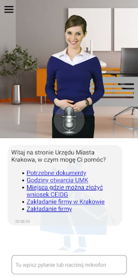 The Virtual Clerk allows you to ask questions about the tasks performed at the Krakow City Hall. He can indicate the appropriate procedures and direct to the right places on the Office's website. He answers the most frequently asked questions, knows addresses and telephone numbers. You can talk to him by voice or by entering text queries.