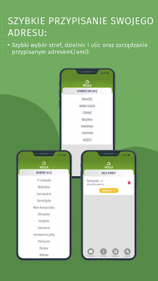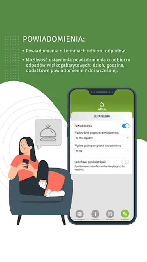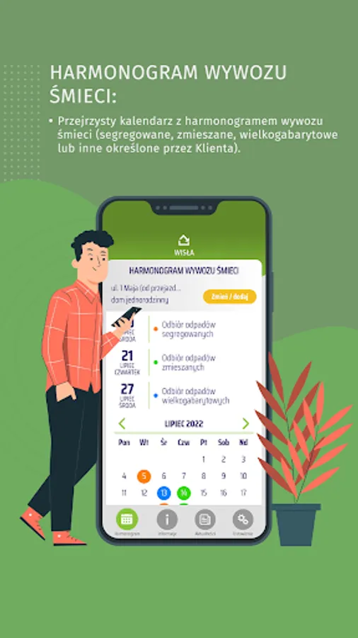 The application "Take out the garbage Wisła" informs about when to put the garbage in the city of Wisła (Śląskie Voivodeship), which makes it easier for the commune to carry out information and educational activities, which belong to the obligations under the Act on waste. The application is a tool that reminds the residents of the City of Wisła about the upcoming waste disposal date.
