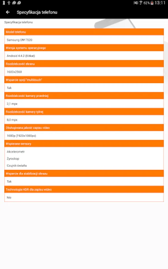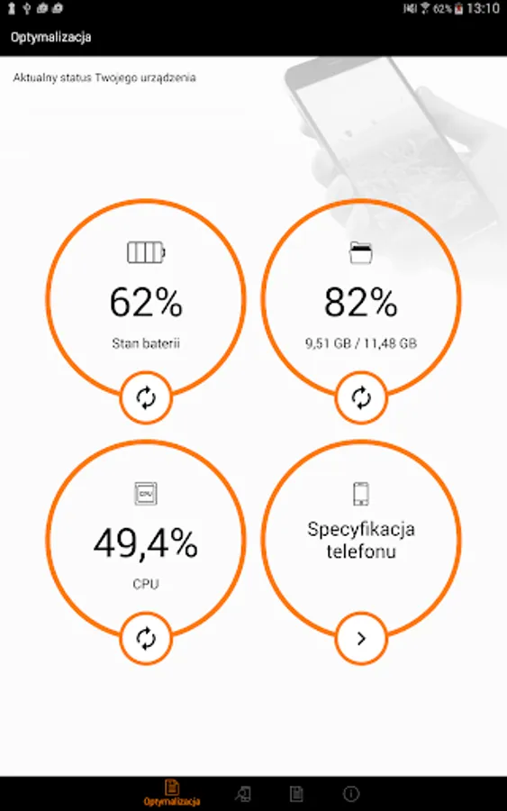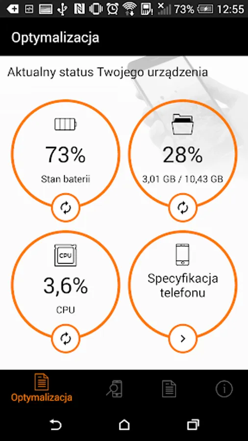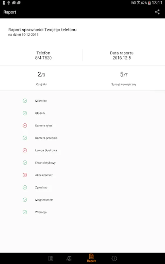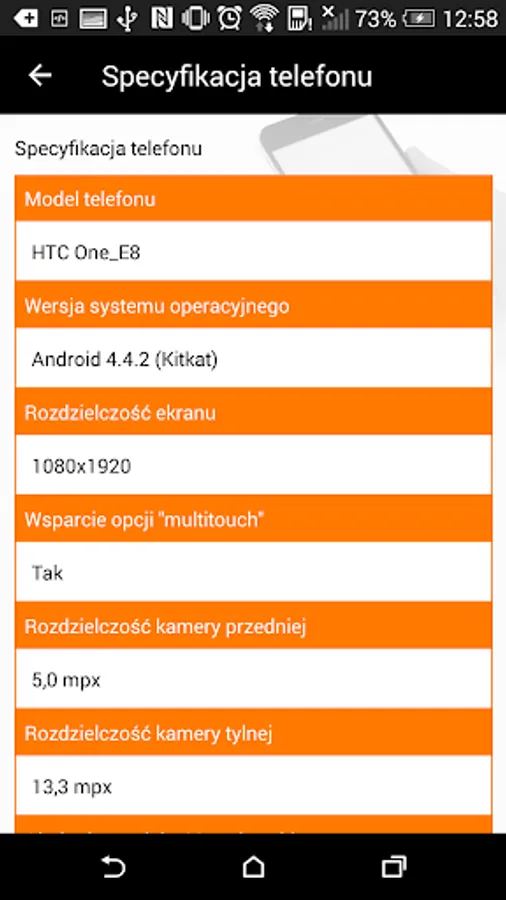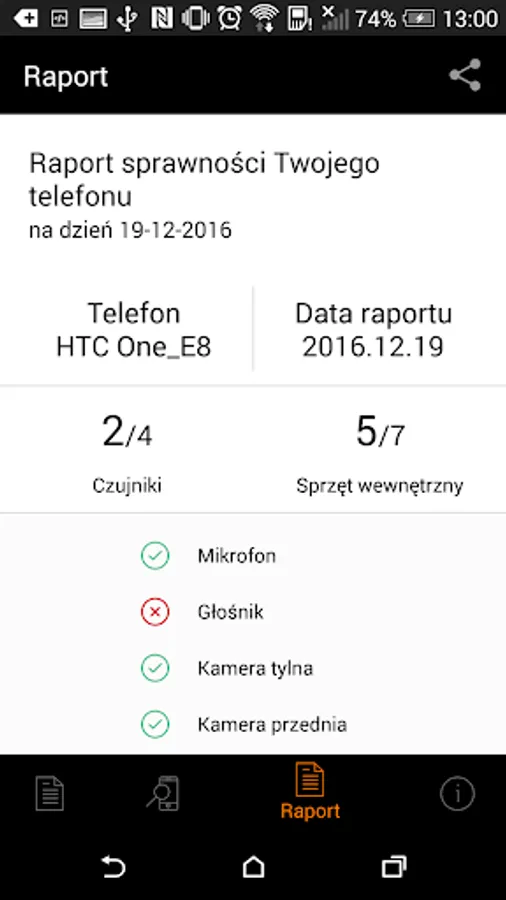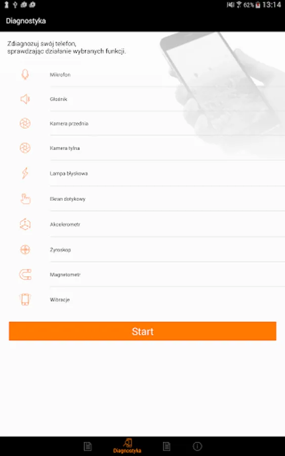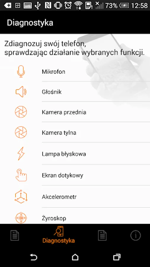 The application is an additional element of the first on the Polish market service phone services such a wide range of Orange Smart Care. This will allow you free, available at any time diagnostics smartphone. The application allows you to check the status of: screen, microphone, camera, flash, speaker, accelerometer, gyroscope, magnetometer, proximity sensor and vibration. Once carried out the test will receive a detailed report of your performance. Additionally, the tool provides information about the current status of the device and its specifications.