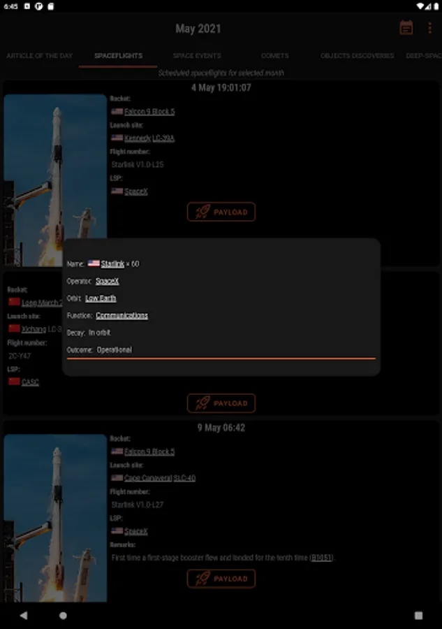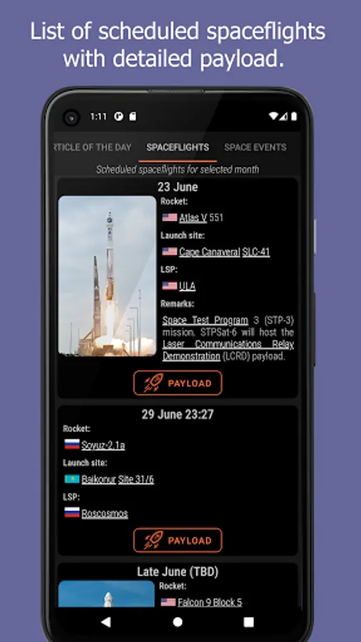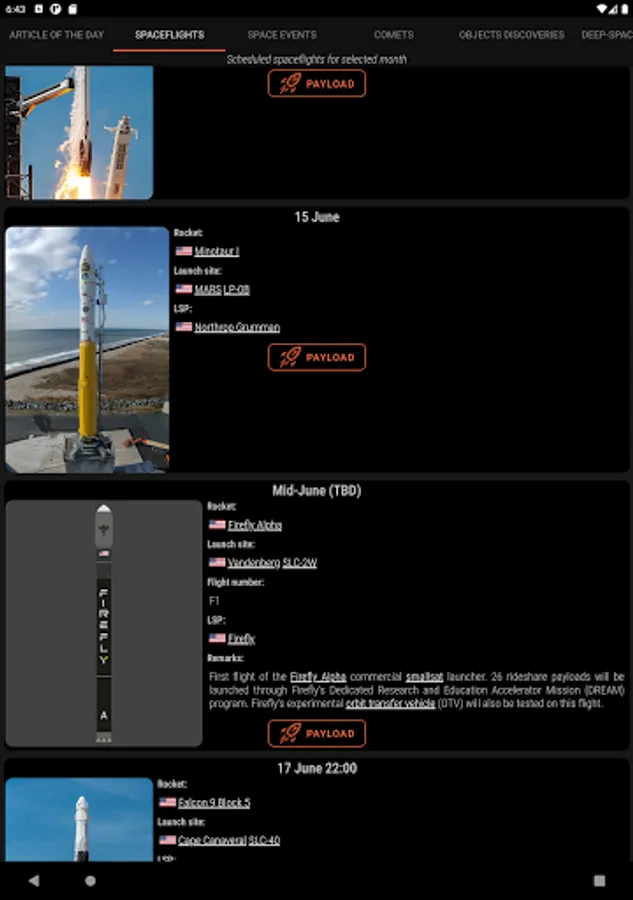 ✓ all the spaceflights scheduled around the world by all launch service providers (NASA, Roscosmos, JAXA, ISRO, SpaceX, Blue Origin, RocketLab, ULA, CASC, Arianspace, Starsem, RVSN RF, Northrop Grumman, ISA...) with detailed payload, rocket type, operator info, orbit, function description etc.