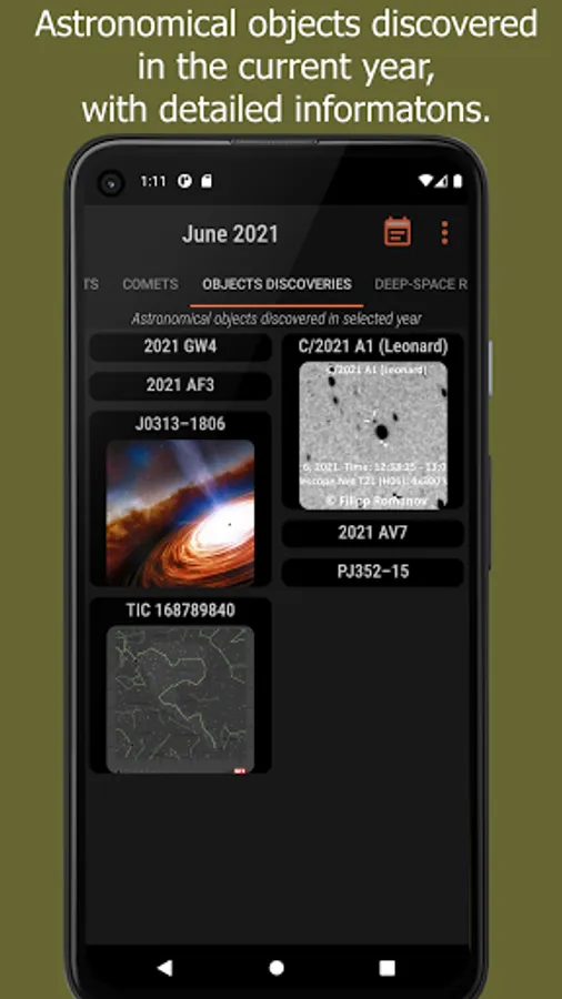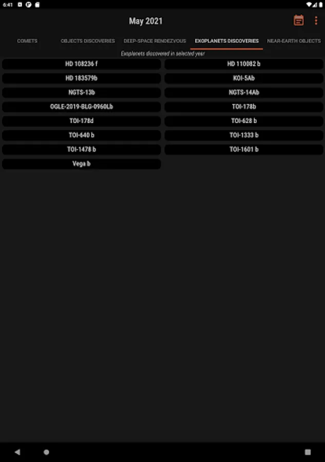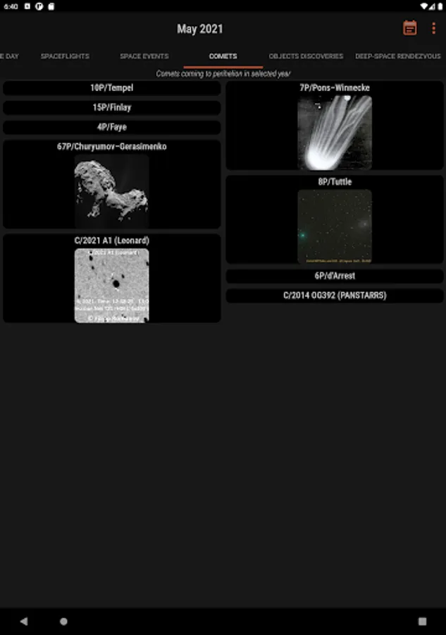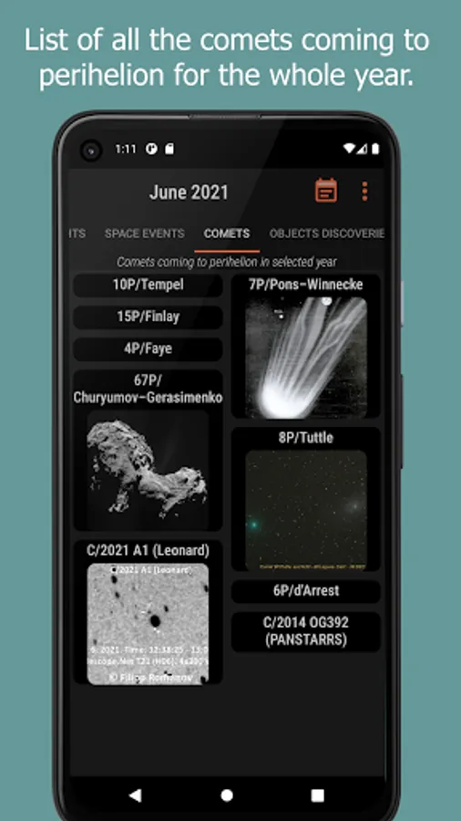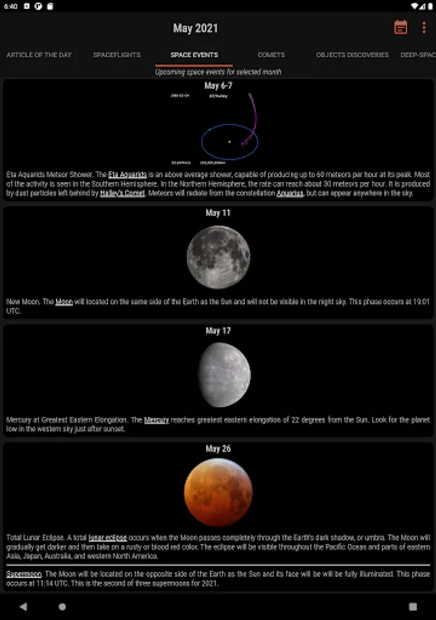 ✓ space/cosmic events for current year and every month (lunar/solar eclipses, conjunctions, comets, meteors showers peaks, moon phases, planets oppositions, equinox/solstice...),