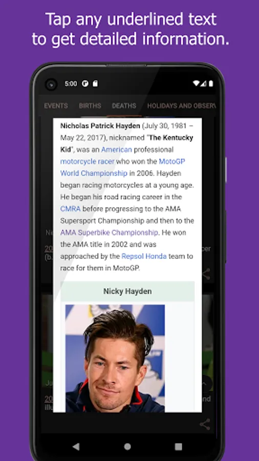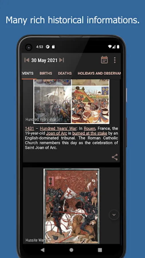 With Today in History, it's easy to access historical events. Simply open the app to see today's historical events or choose any other day of the year to discover events from that date. Our rich media library features images that bring history to life, with zoom-in capabilities that allow you to see every detail. Plus, our event descriptions include clickable links to Wikipedia pages, so you can easily access more detailed information and learn about the significance of each event.